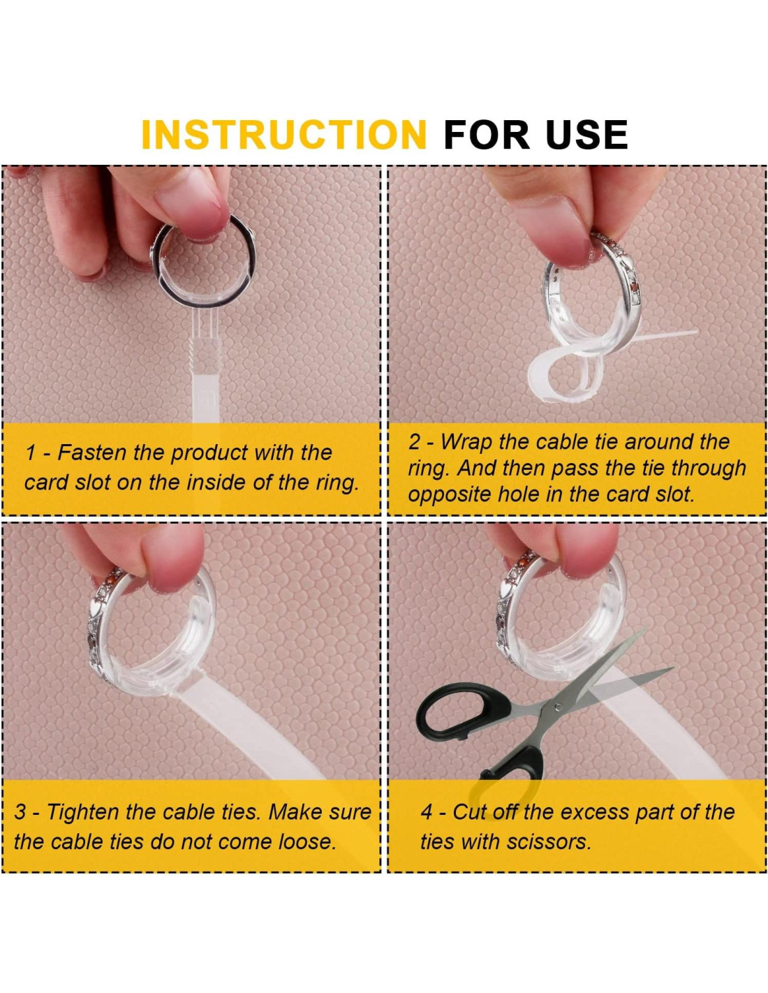 - Fácil de Usar Solo necesitas elegir un ajustador de anillo del ancho apropiado, insertar la correa en el pequeño agujero para fijarlo, hay engranajes para evitar que se afloje, y cortar el exceso. Operación simple para hacer que el anillo se ajuste perfectamente a tu dedo y usar tu anillo perfectamente.