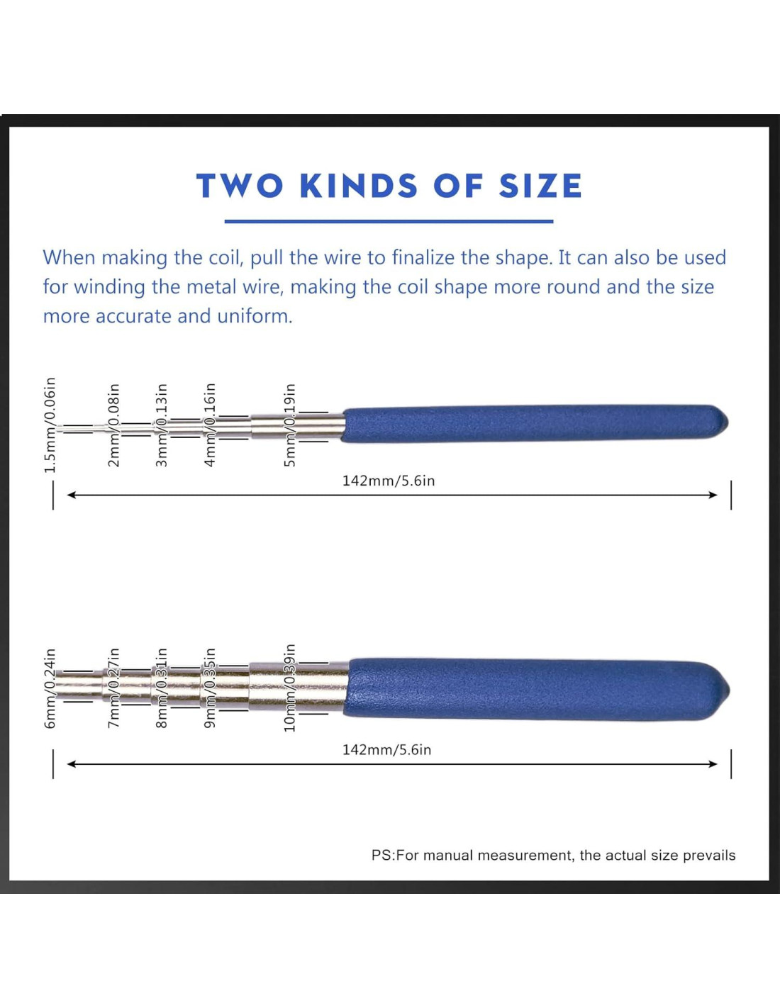 - MANDRIL PARA ANILLOS DE SALTO: Cada mandril tiene 5 tamaños, los delgados son 1.4mm, 1.9mm, 3mm, 4mm, 5mm; los gruesos son 5.9mm, 6.9mm, 7.9mm, 8.9mm, 9.9mm. Las dimensiones se miden manualmente, puede haber algunos errores.