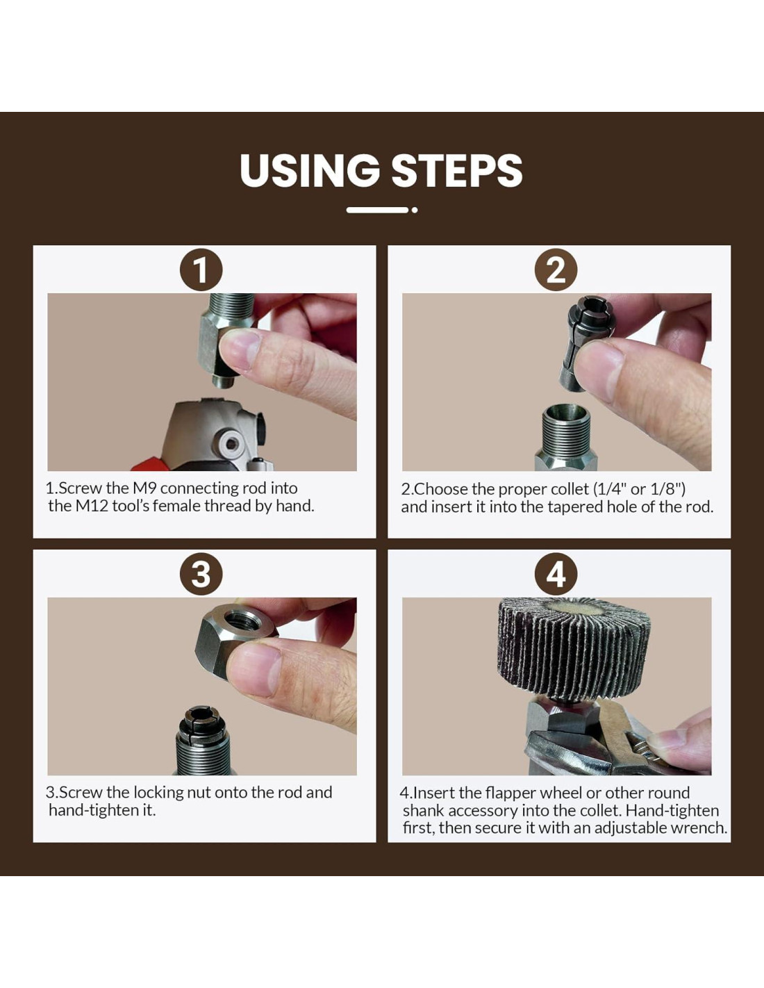 - Mandriles de doble especificación para satisfacer diversas necesidades: Equipado con mandriles de 1/4" (6.35 mm) y 1/8" (3.18 mm), puede sujetar firmemente varias ruedas de molienda de mango redondo, ruedas de brocas y otros accesorios. Ya sea para molienda fina o operaciones de pulido rutinarias, puede manejarlas con facilidad, proporcionando más posibilidades para su trabajo