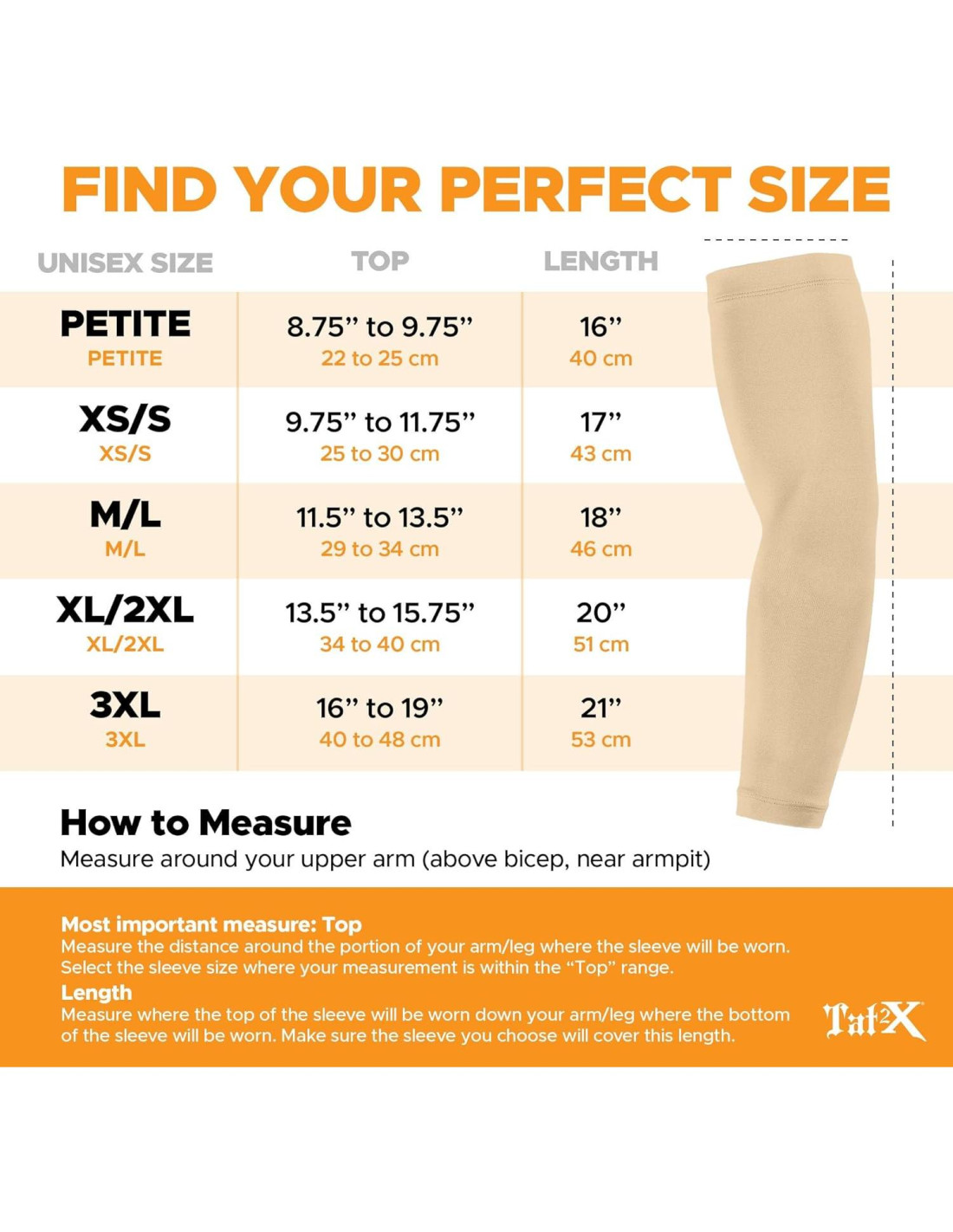 Mide alrededor de tu brazo superior (por encima del bíceps, cerca de la axila). Selecciona el tamaño de la manga donde tu medida esté dentro del rango.
