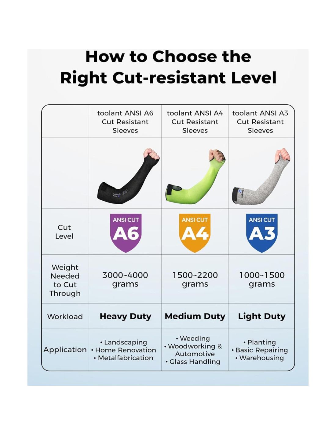 - [Guardias de Brazo Versátiles para el Trabajo] Desde trabajos de carga media hasta trabajos pesados, jardinería, cuidado de mascotas, carpintería, fabricación de metal, HVAC, instalación de vidrio y construcción, toolant ofrece mangas resistentes a cortes con diferentes niveles de protección (A3, A4, A6) para brindar tanto seguridad como comodidad durante todo el día.