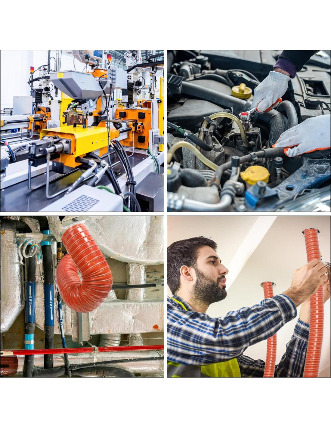 - [Material] Hecho de silicona retardante de llama de doble capa + material de tela de fibra de vidrio de doble capa, soportado con alambre de acero de resorte interno. La resistencia a la temperatura del conducto de aire, resistencia a la corrosión, flexible, interno suave y fuerte sellado. CONSEJOS: ¡DEBE USAR GUANTES cuando lo toque y use porque es fibra de vidrio! (Par de guantes incluido en el paquete)