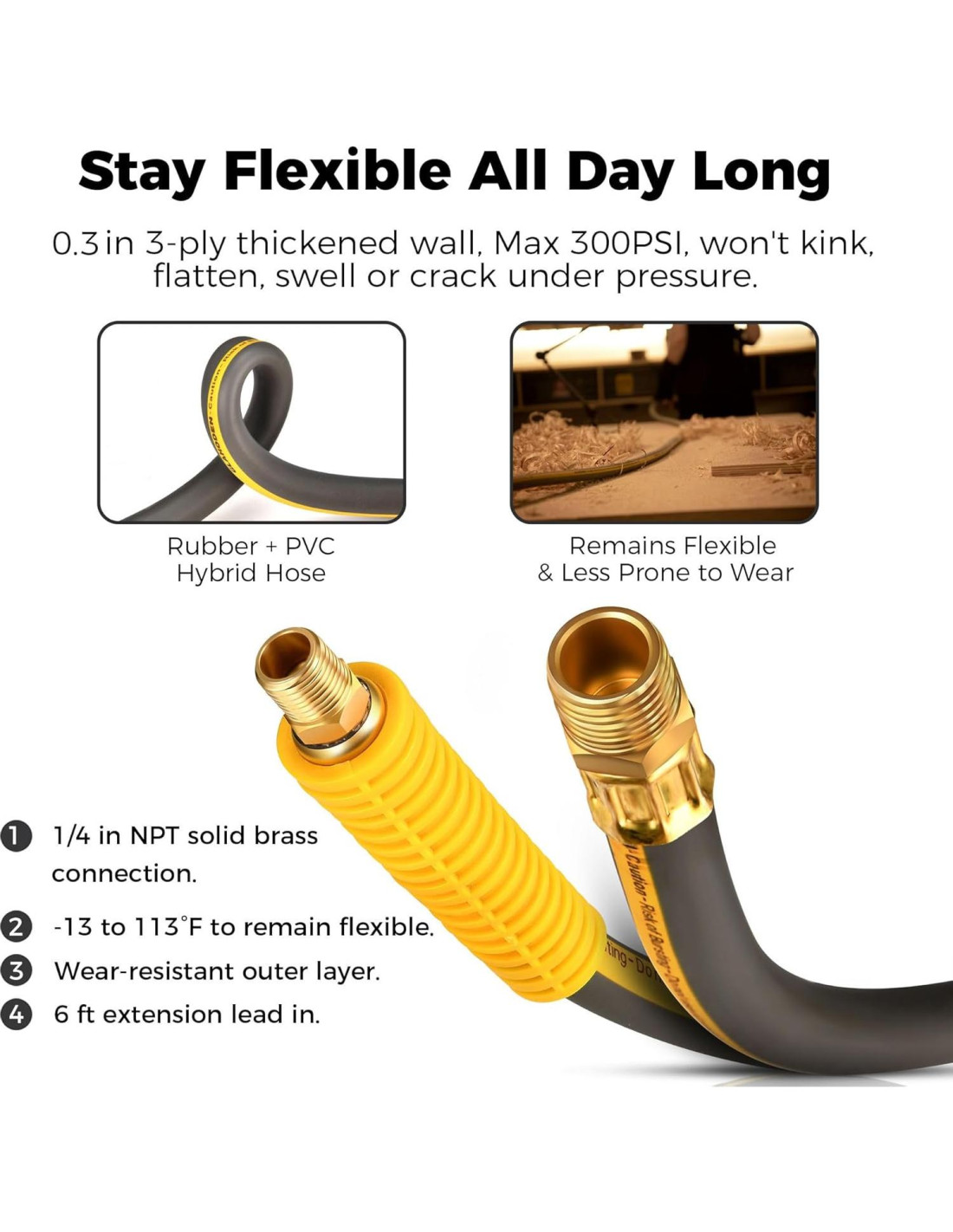 - Manguera Flexible y Cable de Extensión de 1.8 m: Manguera de polímero híbrido premium con flexibilidad extrema para todo clima, que será útil cada invierno (-25 a 45 C). El grosor de la pared de la manguera de doble capa de 0.76 cm soporta hasta un Máx 300 PSI, por lo que no se doblará, aplanará, expandirá ni agrietará bajo presión. La ID de la manguera de aire retráctil es de 1/2 pulgada (solo 0.89 pulgada en productos similares), lo que aumenta el flujo de aire en un 5%.