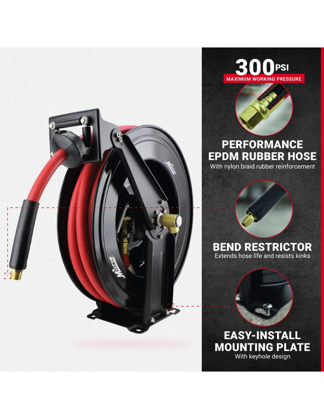 - Características especiales: MANGUERA DE CAUCHO EPDM DE RENDIMIENTO: Se mantiene flexible en frío y resiste agrietamientos, abrasión y productos químicos. -RETROCESO AUTOMÁTICO: Motor de resorte cerrado, con bola ajustable para detenerse en la longitud deseada. -ORIFICIOS DE MONTAJE EN FORMA DE LLAVE: Diseñados para una fácil instalación en techos, paredes, bancos o camiones. -IDEAL: Para proyectos de alto flujo de aire. Pintura con recubrimiento en polvo y conexiones de latón sólido, construidas para durar. -El restrictor de doblez extiende la vida útil de la manguera y resiste dobleces.