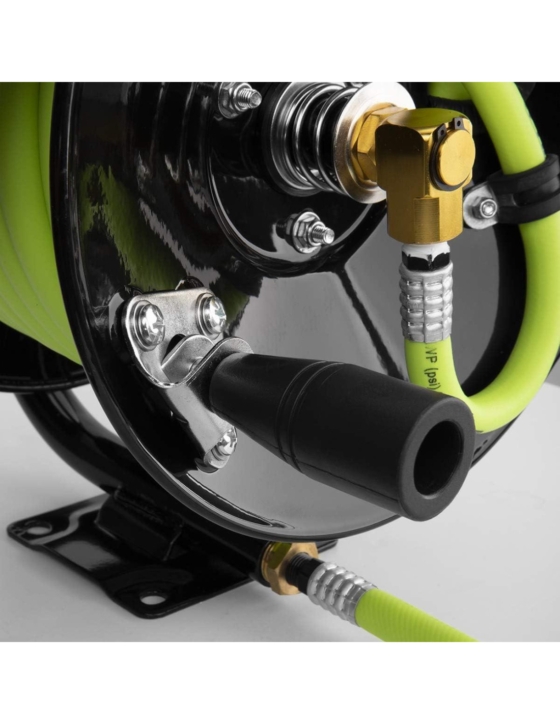 - FÁCIL DE ALMACENAR - Monte el carrete con el soporte de montaje en paredes, bancos de trabajo o camiones de trabajo con facilidad. Las paredes laterales en ángulo permiten más almacenamiento de manguera en menos espacio. El freno evita que la manguera se desenrolle involuntariamente