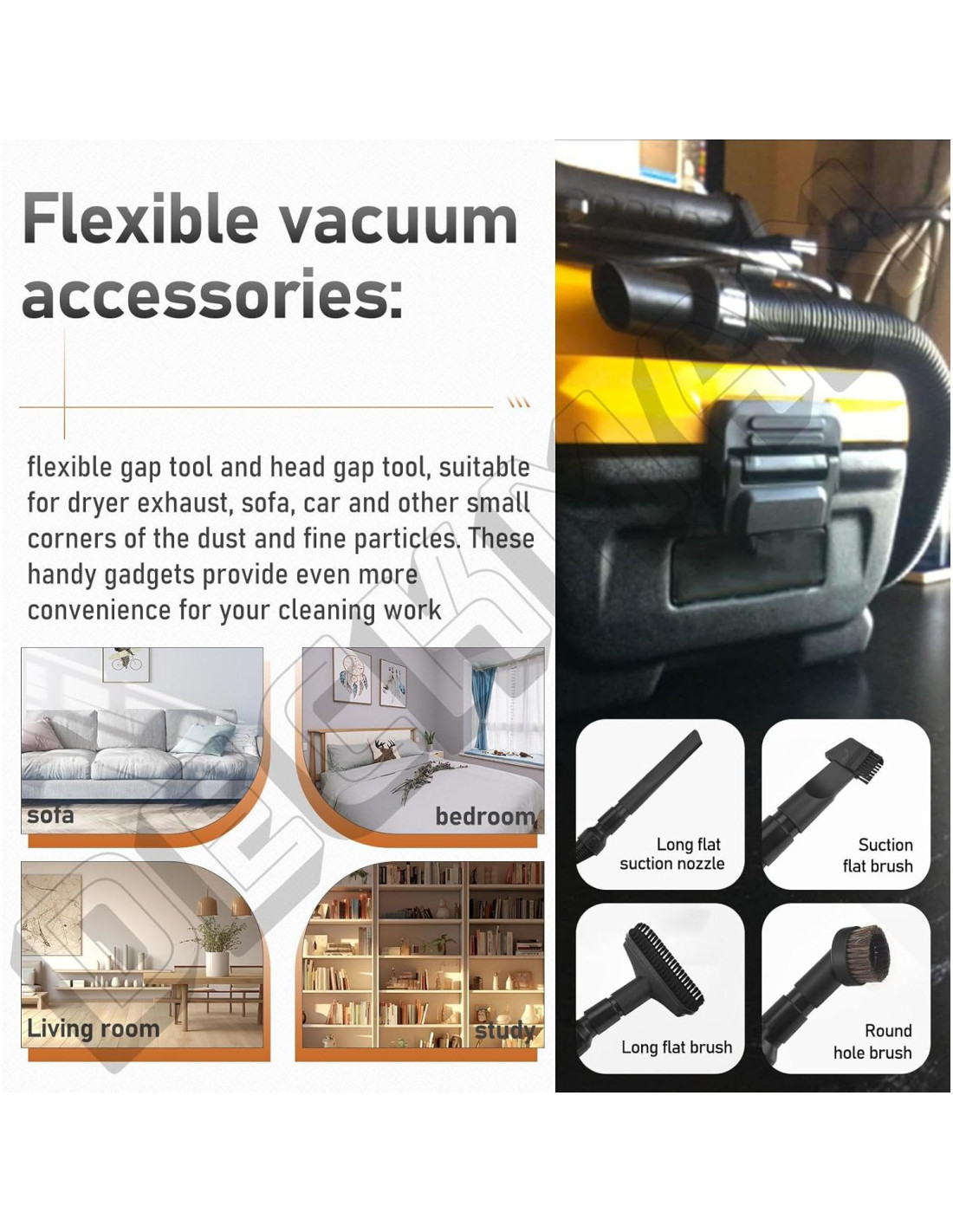 - Accesorios de aspiradora flexibles: herramienta de espacio flexible y herramienta de espacio de cabeza, adecuadas para escape de secadora, sofá, automóvil y otros pequeños rincones del polvo y partículas finas. Estos útiles gadgets proporcionan aún más comodidad para su trabajo de limpieza