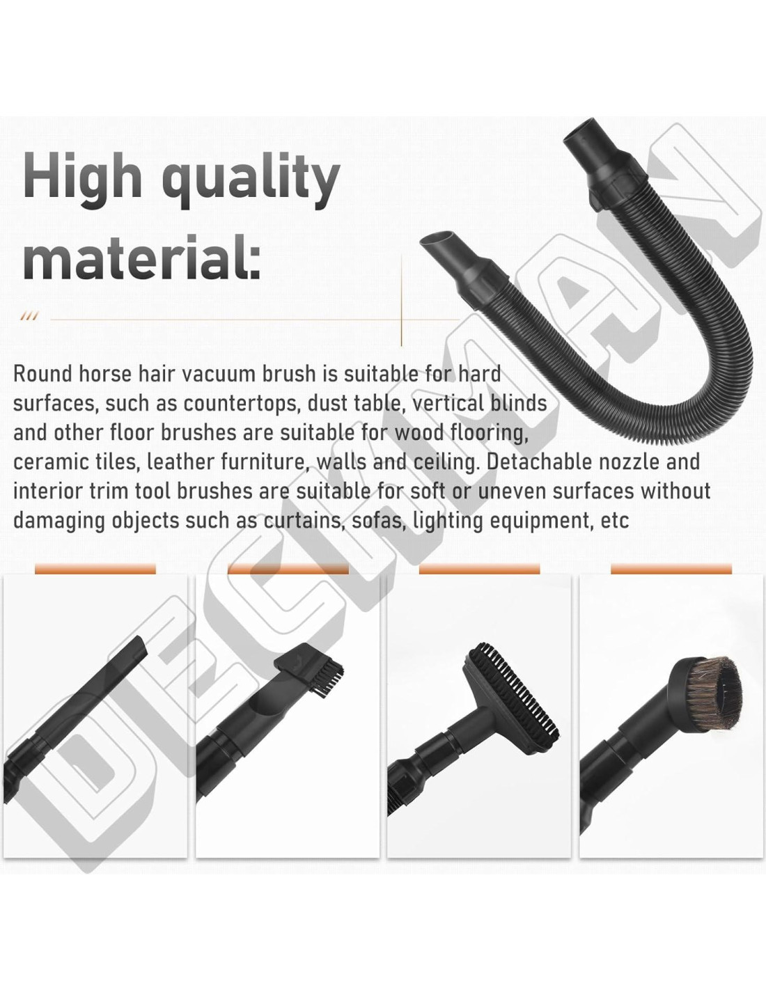 - Material de alta calidad: Cepillo de aspiradora de pelo de caballo redondo es adecuado para superficies duras, como encimeras, mesas de polvo, persianas verticales y otros cepillos de piso son adecuados para pisos de madera, baldosas de cerámica, muebles de cuero, paredes y techos. Boquilla desmontable y cepillos de herramienta de acabado interior son adecuados para superficies suaves o irregulares sin dañar objetos como cortinas, sofás, equipos de iluminación, etc.