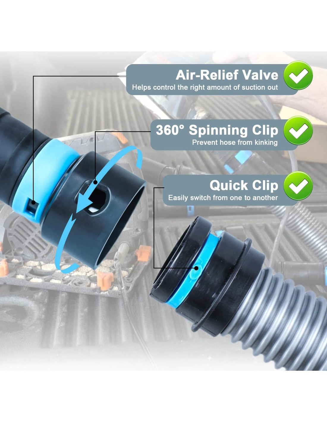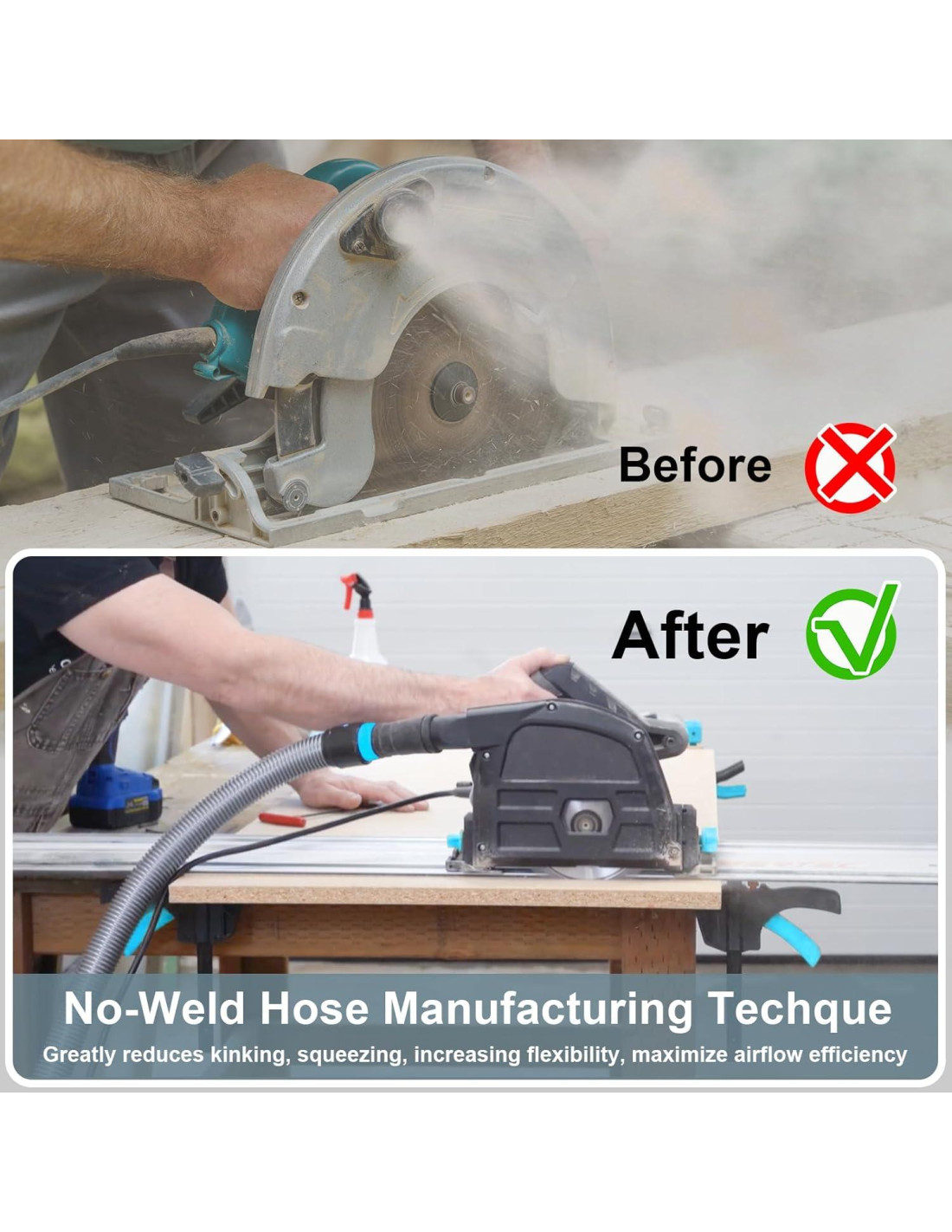 - Superficie Lisa, Clip Giratorio de 360 Reduce significativamente el torcimiento de la manguera de aspiradora de taller, permitiéndole arrastrar libremente sin quedar atrapado por esquinas, considerando que puede haber mucho movimiento en su taller de carpintería. Además, el polvo y la suciedad pasan a través de manera más eficiente, maximizando la eficiencia del flujo de aire.