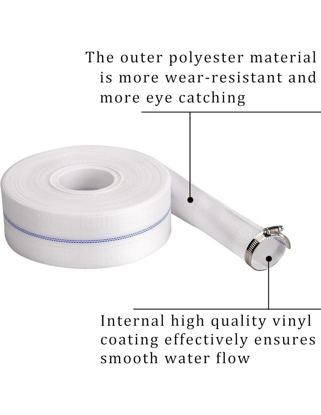- Manguera de Retrolavado de Piscina: La capa exterior está hecha de hilo de poliéster de alta calidad, resistente a la abrasión y a la ruptura; La pared interior está recubierta con vinilo extruido, flexible y ligera, a prueba de fugas, suave para el flujo de agua.