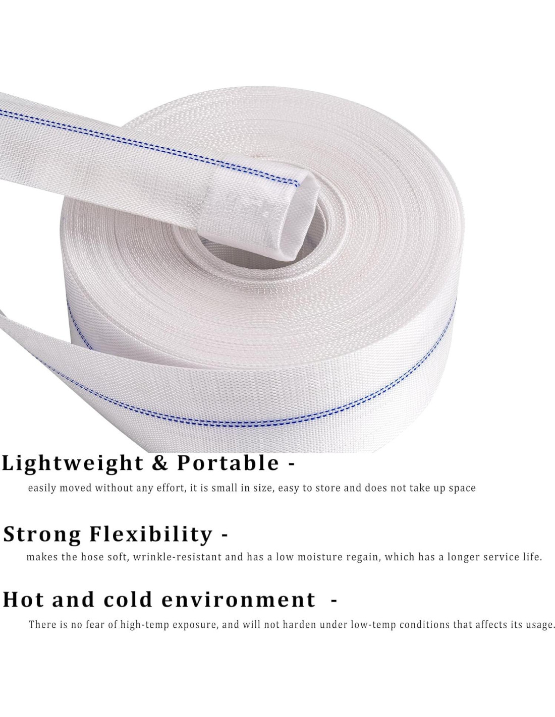 - 2 pulgadas de Diámetro y 3.2 pulgadas de Ancho: Este es el tamaño estándar de la manguera de retrolavado. Las 2" se refieren al diámetro interior de la manguera, lo que significa que puede conectarse a cualquier salida de bomba / tubería de hasta 2" OD estándar. Cuando se coloca plana, el ancho es de aproximadamente 3.2 pulgadas.