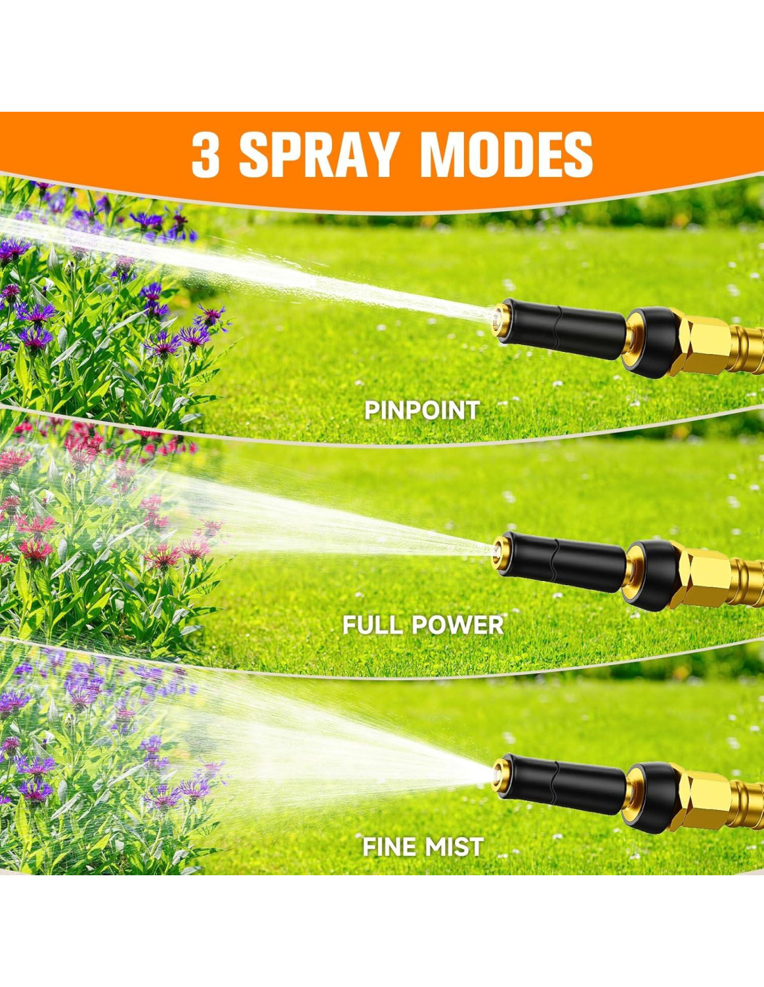 - Patrones de rociado ajustables: Puedes elegir entre una variedad de modos de riego diferentes para tu manguera de jardín, que van desde aspersores; duchas hasta chorros de agua a alta presión para tus necesidades de riego y limpieza. La manguera de acero inoxidable tiene un mango de goma que es antideslizante y fácil de maniobrar