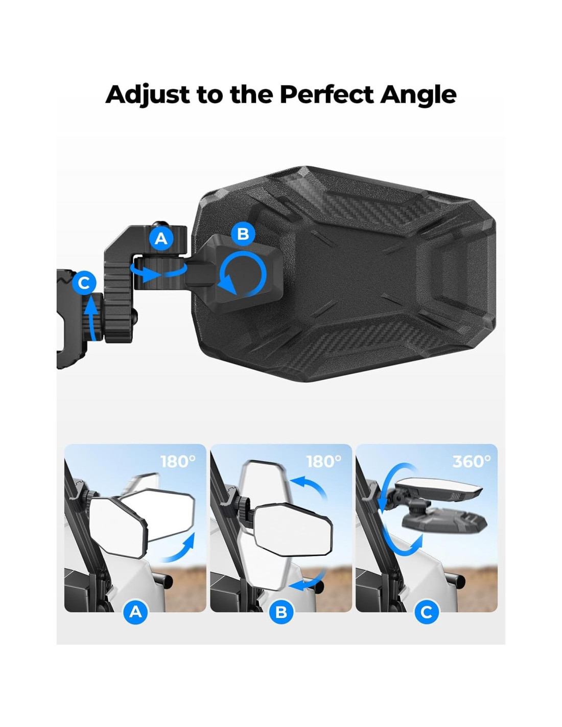 - Rotación Mejorada de 3 Ejes: Los espejos UTV KEMIMOTO cuentan con rotación de 3 ejes para permitir la máxima ajustabilidad. El conector de bola en el soporte del espejo permite una rotación suave y sin herramientas a cualquier ángulo y estilo deseado. 2 ejes en la abrazadera de montaje proporcionan ajustes verticales y horizontales.