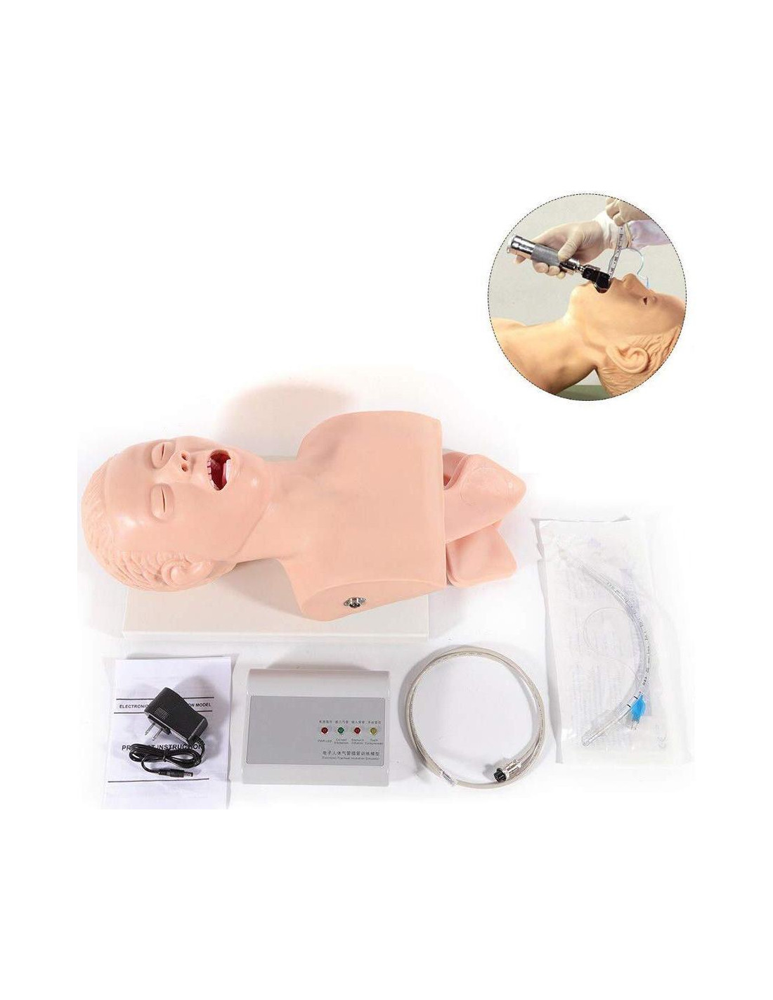 Especificaciones: Material: PVC Voltaje: 220V Características: - Puede realizar operaciones de entrenamiento de intubación oral nasal y demostración de enseñanza. - Durante la operación de entrenamiento de intubación oral y nasal, inserte la operación correcta de la vía aérea, pantalla electrónica y función de reproducción de música, de modo que los pulmones inflen gas. - Operación de entrenamiento de intubación oral y nasal, la operación incorrecta inserta el esófago, pantalla electrónica y función de alarma. Expansión de gas en el estómago. - Error hace que el laringoscopio cause presión en los dientes, función de alarma electrónica. - Observado y comparado con el lado normal y el otro lado se convierte en pupilas grandes. Paquete Incluido: 1 x Modelo de Intubación 1 x Máquina de Alarma 1 x Adaptador de Corriente