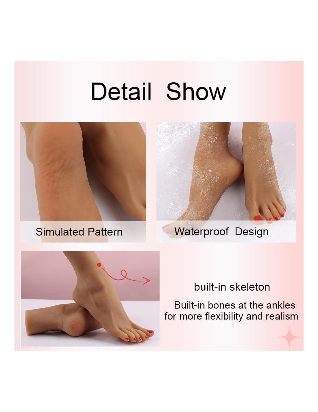 - Material: El modelo de pie maniquí 3D está hecho de un nuevo material polimérico TPE (elastómero termoplástico), que es resistente a desgarros, nuestros pies tienen huesos dentro, los dedos pueden doblarse libremente, pero no se pueden fijar en la posición doblada. Artesanía realista 1:1, incluyendo texturas claras que coinciden perfectamente con el ajuste del pie verdadero, producción patentada de moldes invertidos de primera calidad, realismo visual, tacto cómodo.
