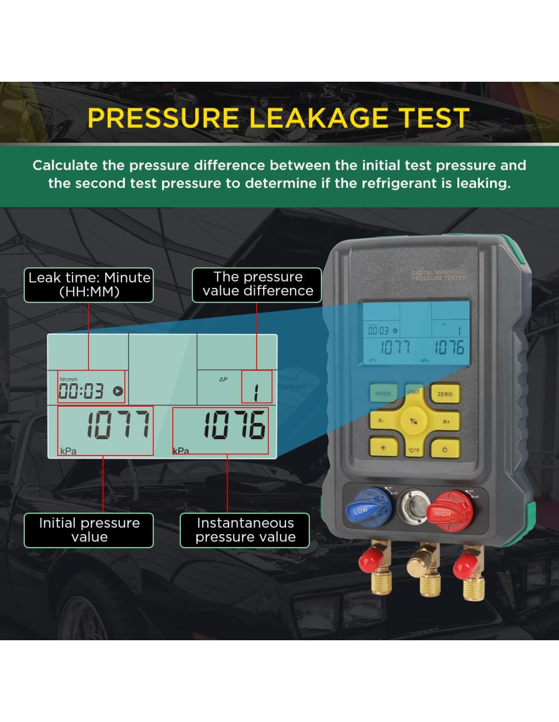 - Prueba de fuga de presión. El manómetro calcula la diferencia de presión entre la presión de prueba inicial y la segunda presión de prueba para determinar si el refrigerante está fugando. El conjunto de manómetros digitales HVAC se utiliza especialmente para la instalación, prueba y mantenimiento de equipos de refrigeración como aires acondicionados, refrigeradores y almacenamiento en frío.