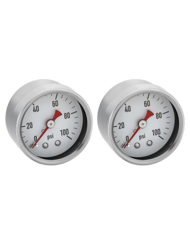 Descripción Solimeta 0-100 Psi Manómetro de Baja Presión Tamaño de Dial 1.5" (3.81 cm), Rosca 1/8" NPT, Caja de Acero Inoxidable y Componentes de Cobre - para Neumáticos de ATV, Calderas de Vapor, Compresores de Aire, Sistemas HVAC, Paquete de 2 Caja de Acero Inoxidable Duradera - Manómetro con caja y bisel de acero inoxidable resistente a la corrosión, diseñado para soportar entornos difíciles para un uso prolongado. Lente de Vidrio Claro - La cara de vidrio resistente a los arañazos asegura lecturas de presión rápidas y fáciles. Componentes de Cobre Confiables - Componentes de cobre de precisión mejoran la resistencia a la presión y la protección contra la corrosión, asegurando un rendimiento constante. Ajuste de Cobre Preciso - Conexión roscada de cobre NPT de 1/8" (0.32 cm) sella de manera segura, compatible con neumáticos de ATV, calderas, compresores y sistemas HVAC. Indicador Rojo Ajustable - El puntero rojo de aluminio móvil marca las presiones objetivo, simplificando el monitoreo para filtros de arena, bombas de pozo y más.