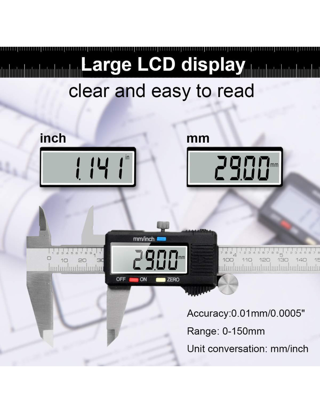 - HERRAMIENTA DE MEDICIÓN CALIBRADOR PRECISA: Rango de medición del calibrador digital Qfun: 0 - 6" (0 - 150mm); Resolución: 0.0004" (0.01mm); Precisión: 0.0007" (0.02mm). El micrómetro digital se desliza suavemente y te permite establecer cero y medir en cualquier punto de la escala