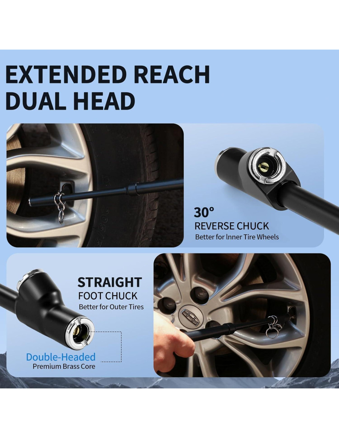 - Cabezas de Latón de Doble Ángulo y Durabilidad en Todas las Condiciones: Accede a válvulas de difícil acceso sin esfuerzo con cabezas dobles: rectas (0) + puntas anguladas de 30. Fabricado con aluminio de grado aeronáutico y núcleos de latón sólido, es impermeable, a prueba de golpes y soporta temperaturas extremas (-29C a 71C) - ideal para pruebas de presión de neumáticos de alta resistencia