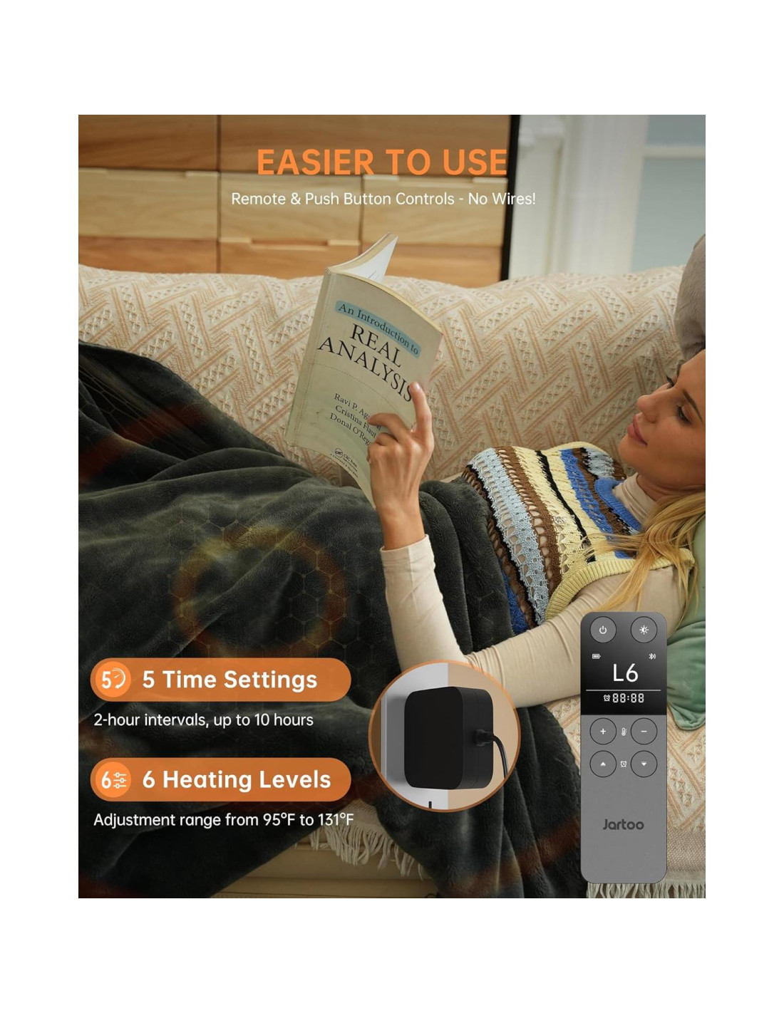 - Más Comodidad sin Cables: El material de calentamiento nano ultra suave y la tela de terciopelo de 320gsm aseguran que la manta eléctrica Jartoo se sienta suave y se ajuste perfectamente a tu cuerpo, eliminando la rigidez y la incomodidad de los cables. Es fácil de llevar, se puede usar en la cama, sofá, oficina, y también es ideal para viajar al aire libre.
