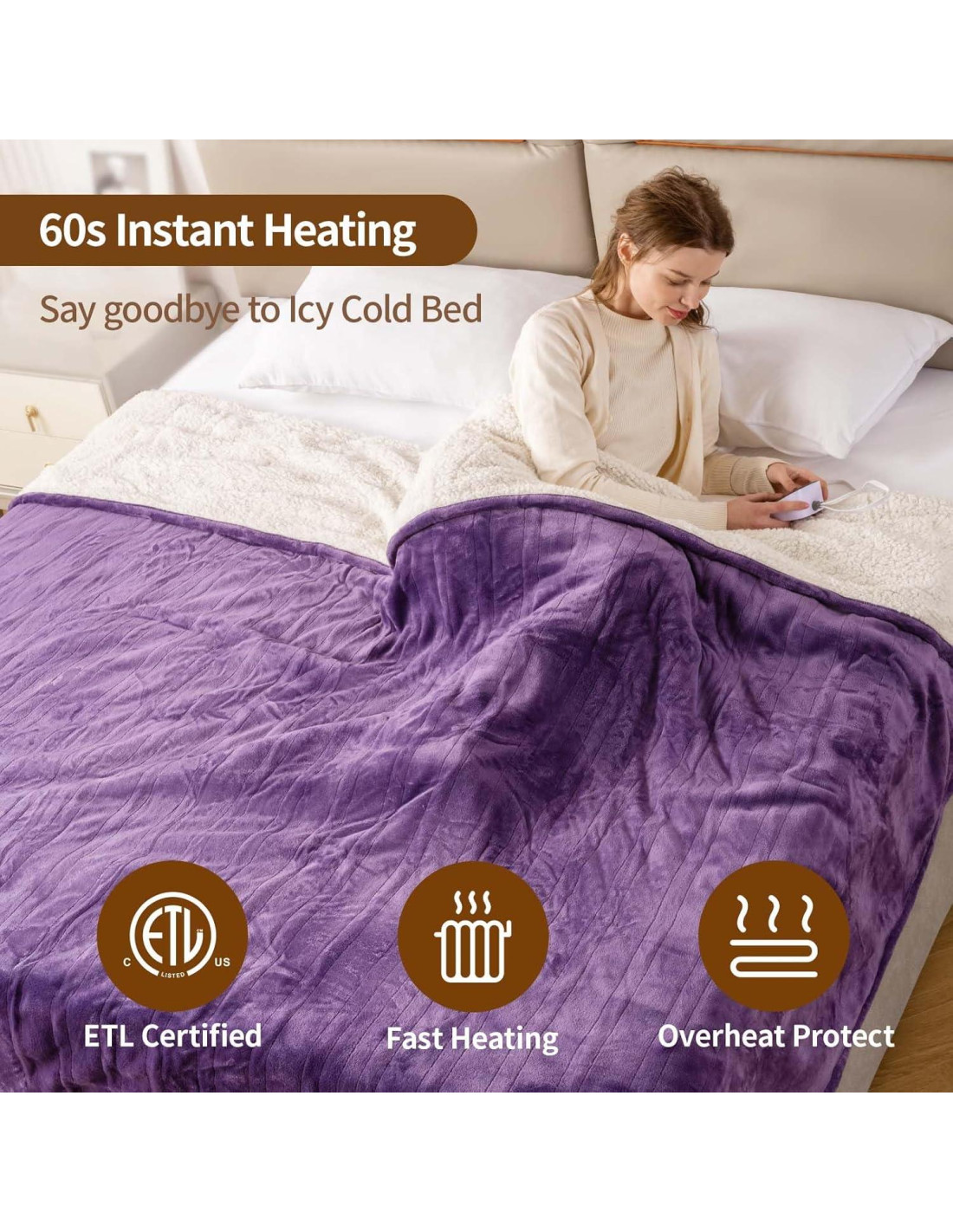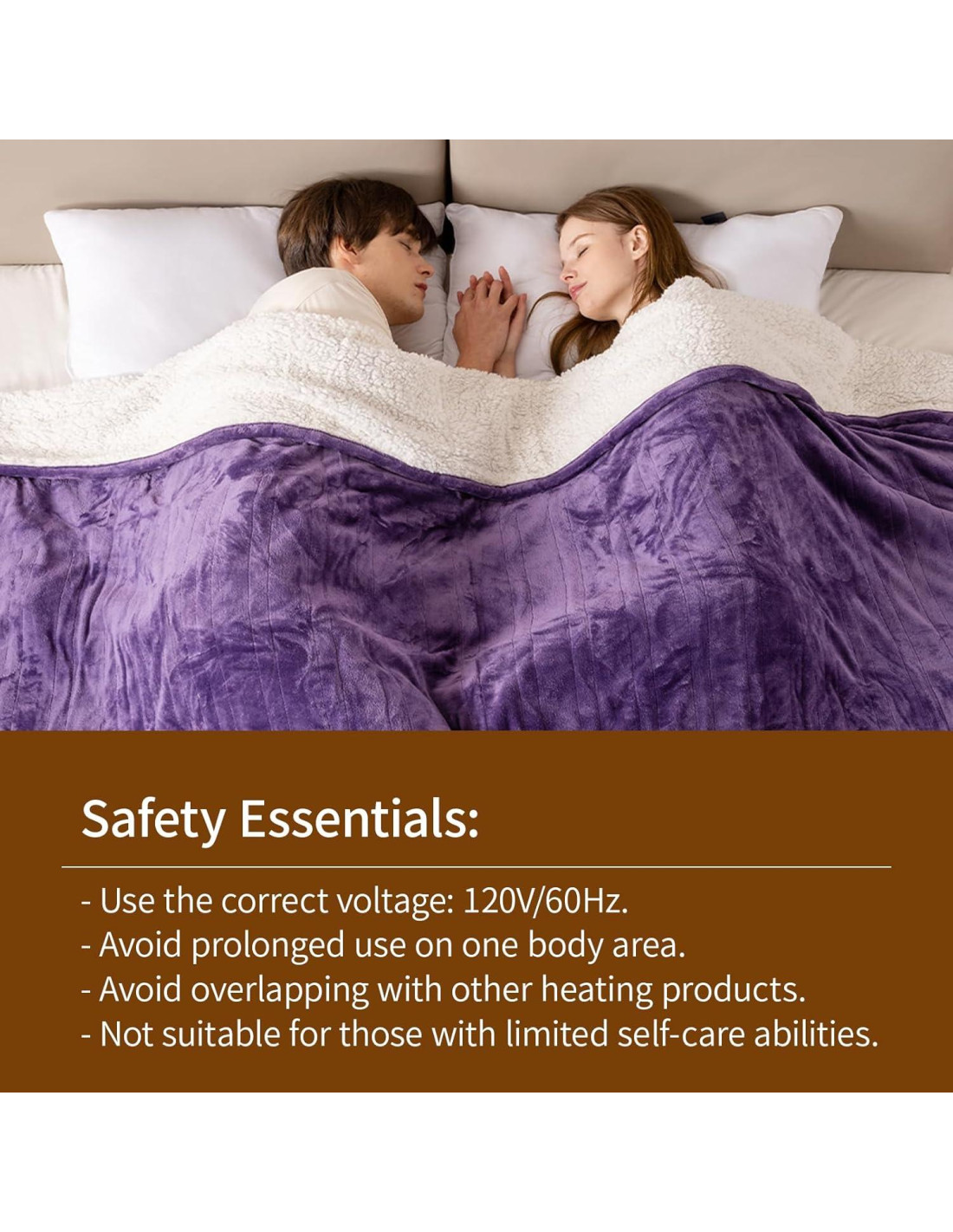 - [Diseño de Terciopelo Púrpura de Lujo y Sherpa Blanco en Tamaño Individual: 62" x 84"] Esta versátil manta eléctrica cuenta con un suave frente de terciopelo púrpura y un reverso de sherpa blanco en un conveniente tamaño individual, perfecto para camas individuales o espacios más pequeños