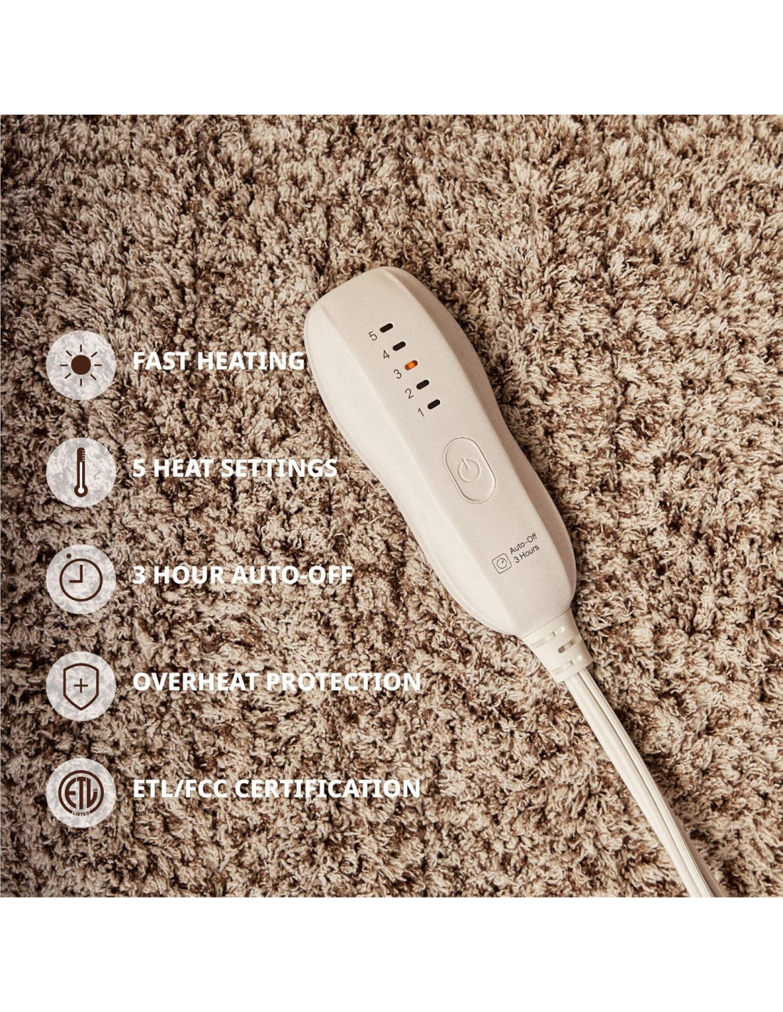 - [Asegura tu seguridad] La manta calentada ha sido aprobada por la FCC y ETL, el controlador tiene la función de apagado automático inteligente, y la manta calefactora de alta calidad se puede apagar automáticamente en 3 horas, la manta calentada se produce con un alto estándar de requisitos de seguridad, protección contra sobrecalentamiento, protegiéndote a ti y a la manta calentada, además se logra ahorro de energía.