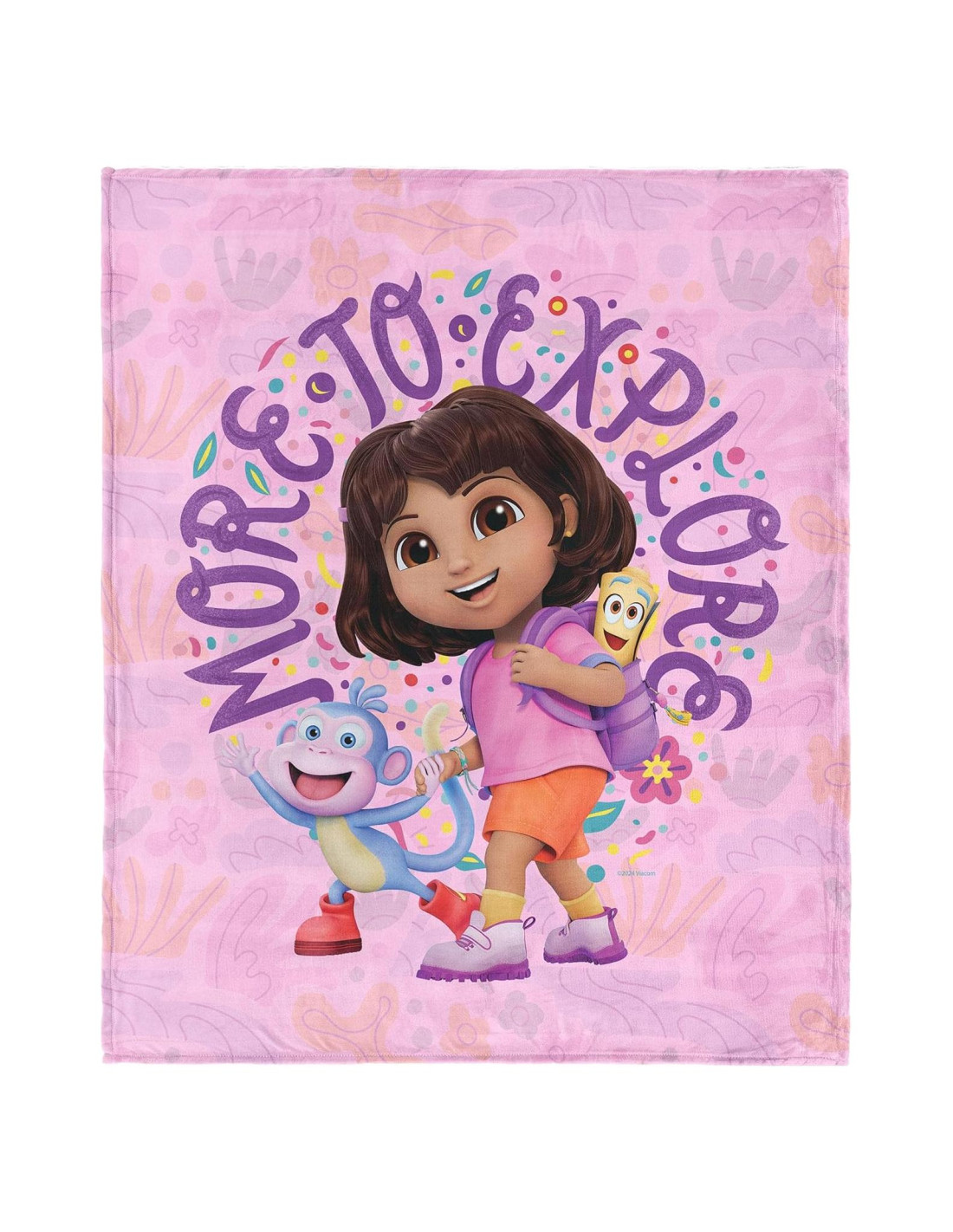 - DISEÑO: Con Dora, Botas y el Mapa, este diseño animado estalla con color y emoción, mostrando la frase "Más para Explorar" contra un fondo rosa juguetón decorado con confeti, flores y un sentido de descubrimiento infinito.