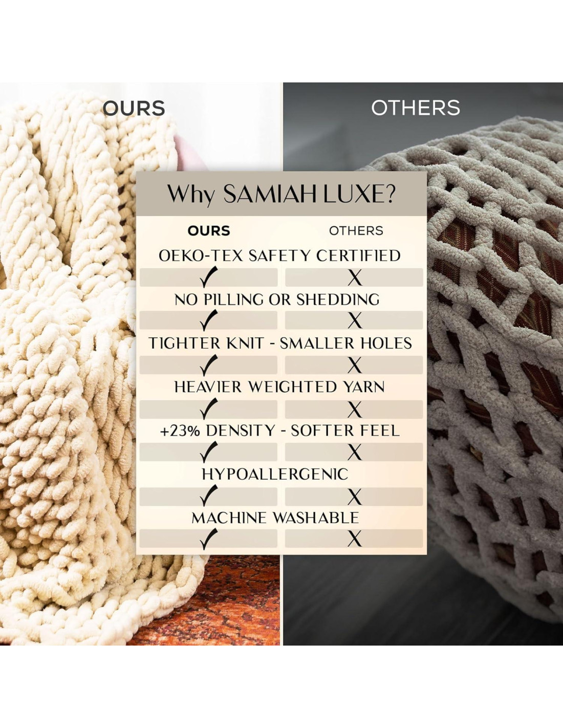 - AMIGABLE CON LA PIEL Y CERTIFICADA OEKO-TEX: Hecha de 100% poliéster vegano y certificada por OEKO-TEX, esta manta chunky de hilo grueso, transpirable y suave como la mantequilla es perfecta para aquellos con piel sensible. Nuestra manta de chenille está libre de fibras ásperas, asegurando que no haya irritación en la piel. Diseñada sin alérgenos, nuestra manta de hilo chunky es lo suficientemente suave para el uso diario mientras proporciona calor sin sobrecalentarse. Nuestra manta pesada tejida de doble cara es excelente para todos los climas y estaciones para comodidad durante todo el año.