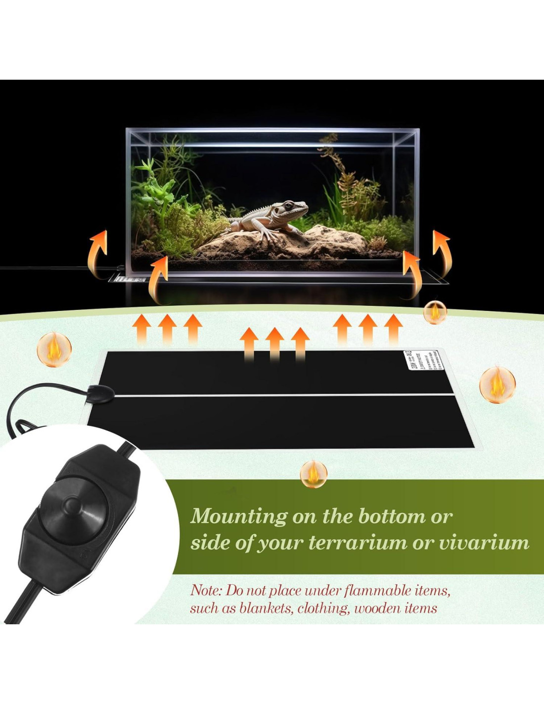 - Instalación Flexible y Calentamiento Lento: la almohadilla térmica para dragones barbudos se puede montar en la parte inferior o en el lado del acuario; Está diseñada para un calentamiento lento para evitar el sobrecalentamiento; Requiere aproximadamente media hora para calentarse; El controlador se puede ajustar según la temperatura real; Además, es importante notar que el dial no muestra números