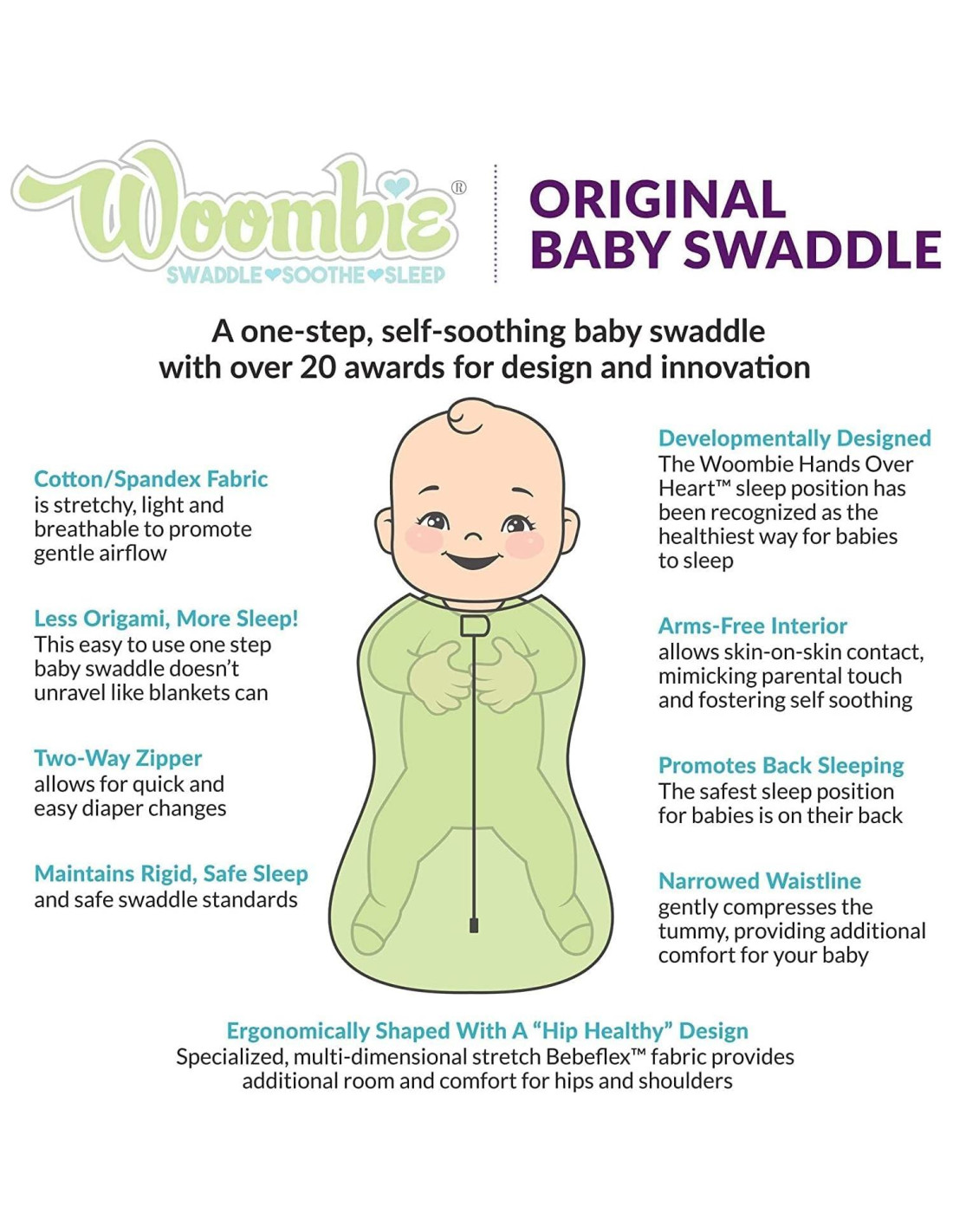 La Manta de Envoltura para Bebés Woombie Original ayuda a las mamás a envolver a sus bebés de la manera en que la naturaleza lo pretendía. Es un envoltorio de sueño autoconfortante de un solo paso. Esta manta portátil tiene una forma ergonómica con un diseño 'saludable para las caderas' y un interior sin brazos que fomenta el autoconfort en la posición de sueño recomendada 'Manos sobre el Corazón'. La compresión suave imita la sensación del tacto, y una cremallera de dos vías evita que se desenrede durante la noche. La tela de mezcla de algodón/espandex es ligera, transpirable y proporciona un estiramiento multidimensional. Viste al bebé de acuerdo con la temporada y la temperatura de la habitación.