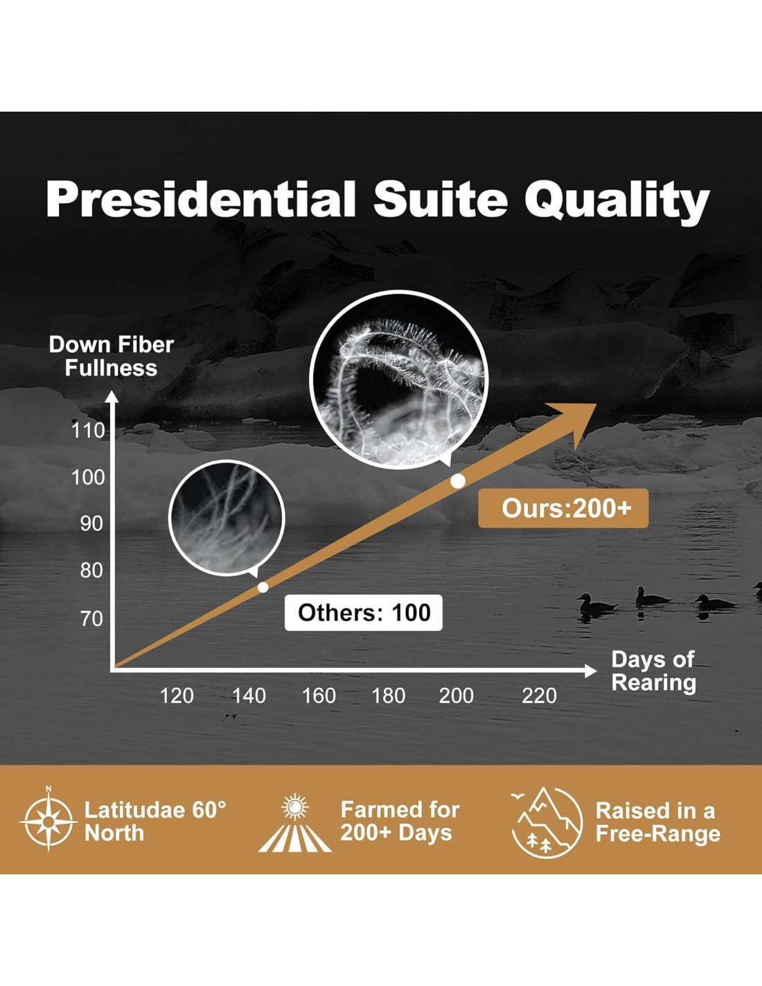 - [Edredón Elite Suite Presidencial] Cultivado en la helada Latitud Norte 60, en contraste con los normales 70-100 días de cultivo para lo ordinario, nuestro edredón de plumas de pato insiste en un período de cultivo que supera los 200 días para presentar tales filamentos de plumas lujosos y completos.