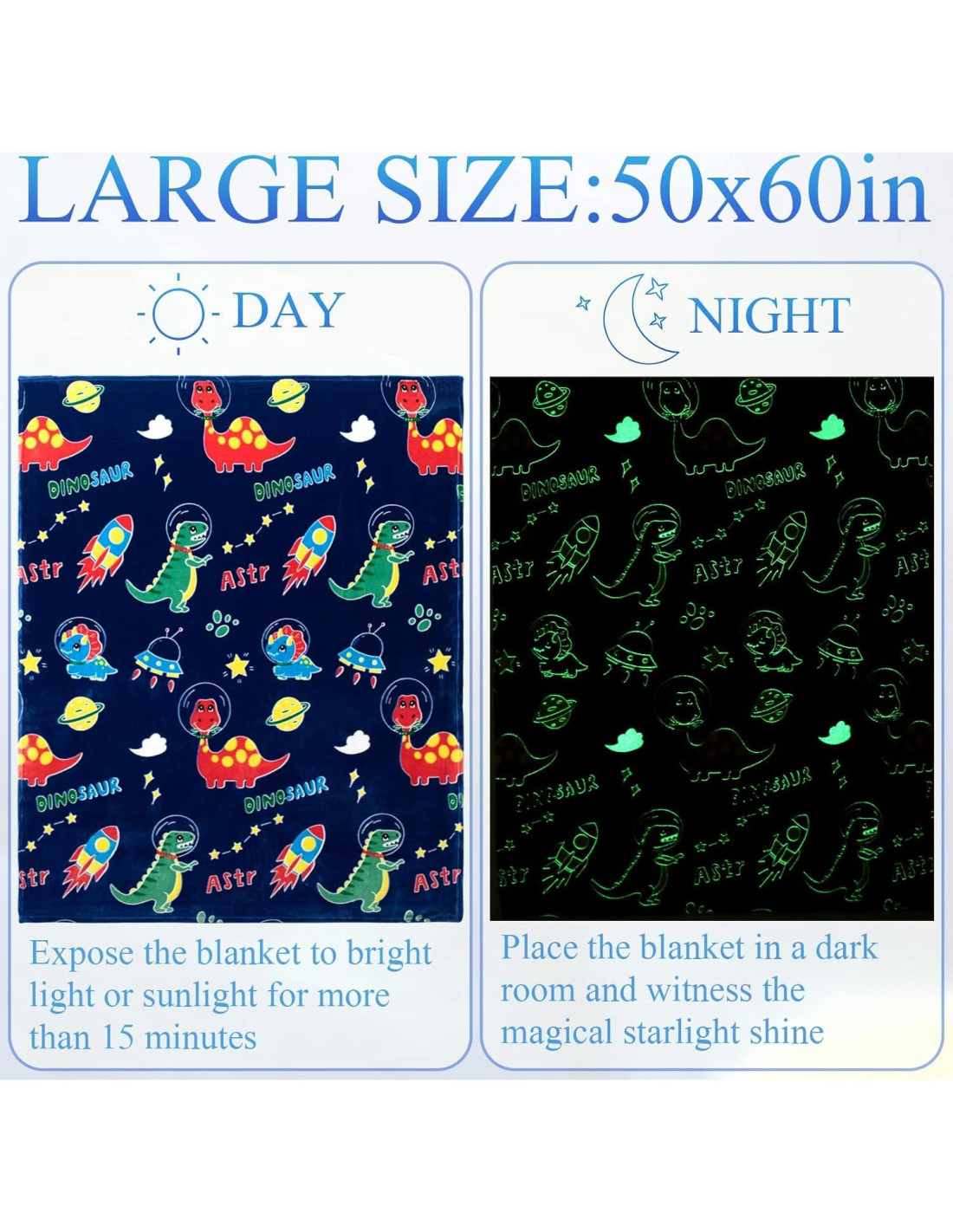 - [Manta para Niños]: Nuestras mantas de dinosaurios son regalos de cumpleaños para niños de 1 a 10 años o sorprende a tus hijos en Navidad, Halloween, Pascua, Acción de Gracias o cualquier ocasión. La manta que brilla inspira diversión para los niños y es el mejor guardián de los niños por la noche