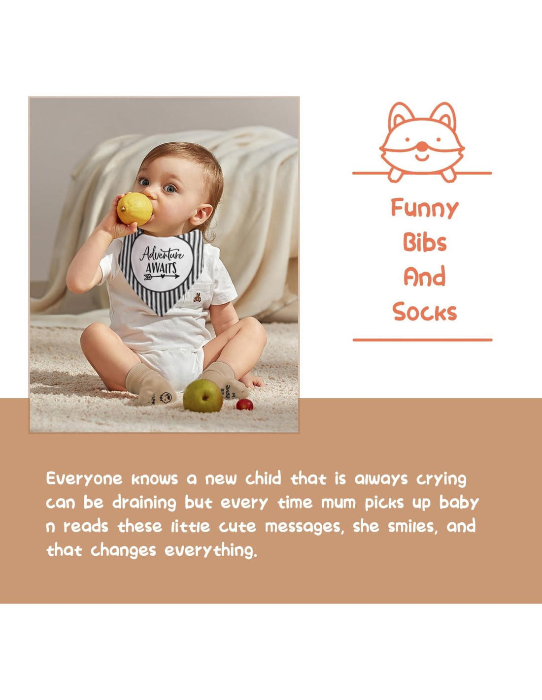 - [REGALOS PARA BEBÉS NIÑAS NIÑOS] Juguetes de madera natural para la dentición suaves y texturizados, sin pintura ni astillas, borde suave, juguete perfecto para agarrar para niños pequeños, también para aliviar la dentición. Baberos divertidos 100% algodón diseñados con impresiones de moda, fáciles de combinar con el atuendo de tu bebé, traen una sonrisa al rostro de todos los que los ven. Y los calcetines para bebés (6-12 meses) con agarre ofrecen antideslizante, grippers redondeados para los niños mientras gatean, caminan y corren.