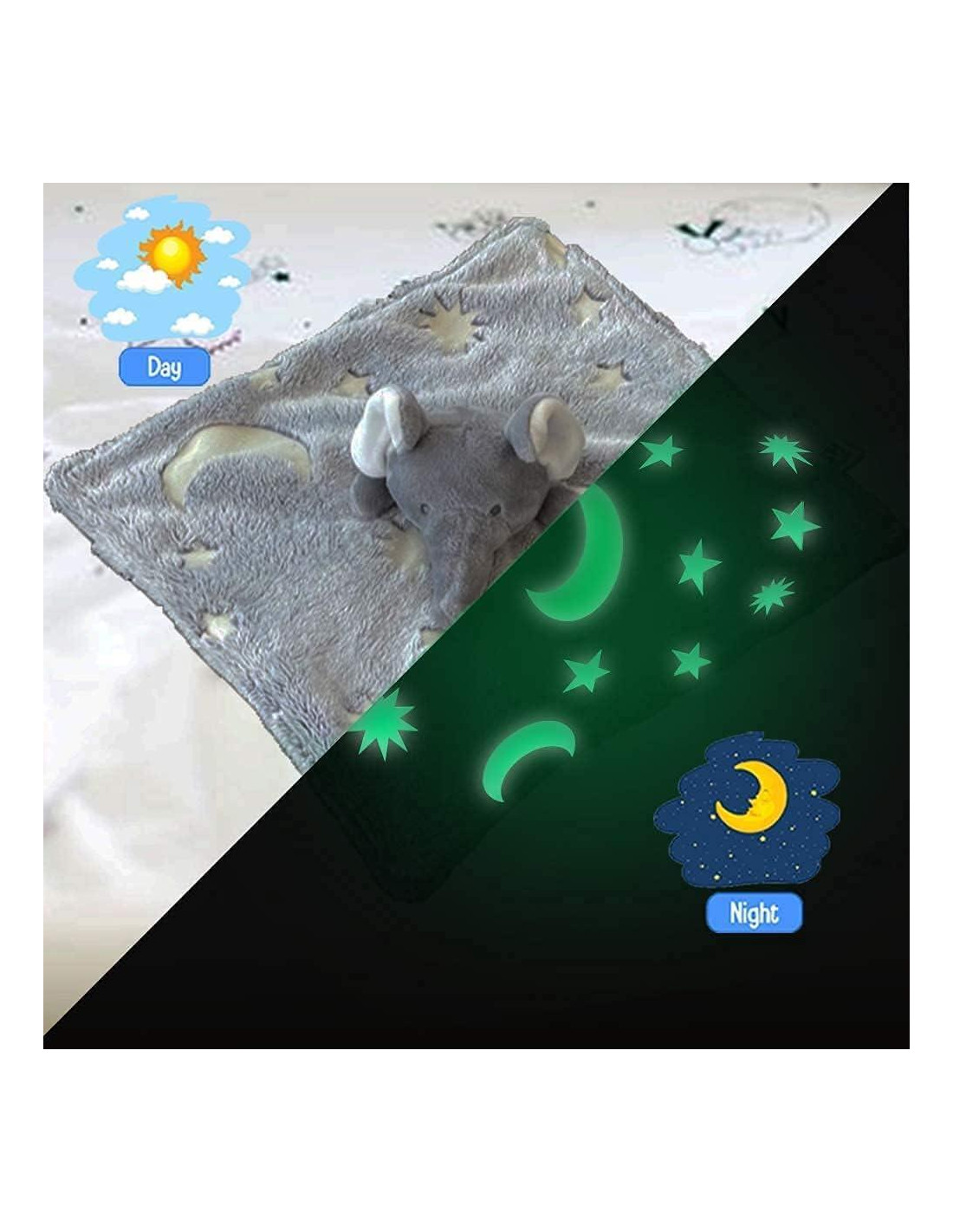 - Diseño Bonito de Manta de Animal de Peluche: Nuestra manta gris brilla en la oscuridad con estrellas y luna en ella, por lo que tu bebé siempre tendrá una fuente de luz suave y nunca tendrá miedo de la oscuridad. Para que la manta de seguridad brille en la oscuridad, déjala plana al sol o en luz brillante durante 15 a 20 minutos.