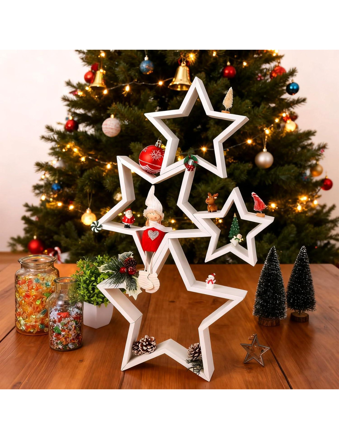 - Fácil Montaje y Almacenamiento: Cada estrella de madera puede ser exhibida individualmente o combinada para crear efectos decorativos impresionantes. El diseño permite un montaje rápido, permitiéndote ajustar el estilo de exhibición según sea necesario. El diseño apilable hace que el almacenamiento posterior a las festividades sea simple, ahorrando espacio y manteniendo tu hogar ordenado.