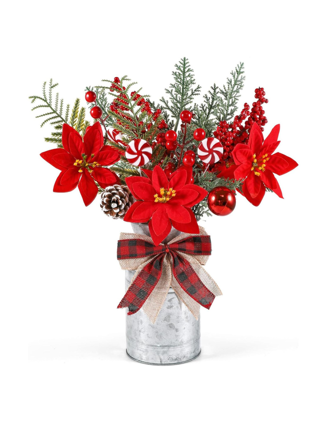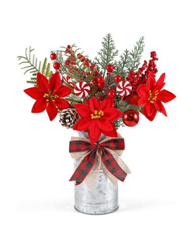 - [Paquete] : El ramo de flores artificiales navideñas incluye 4 ramas, 1 jarrón adjunto con lazo, satisface las demandas decorativas. Puedes ajustarlo según lo requieras ya que el tallo de flores y hojas está hecho de plástico y alambre de hierro envuelto por dentro cuando lo recibas.