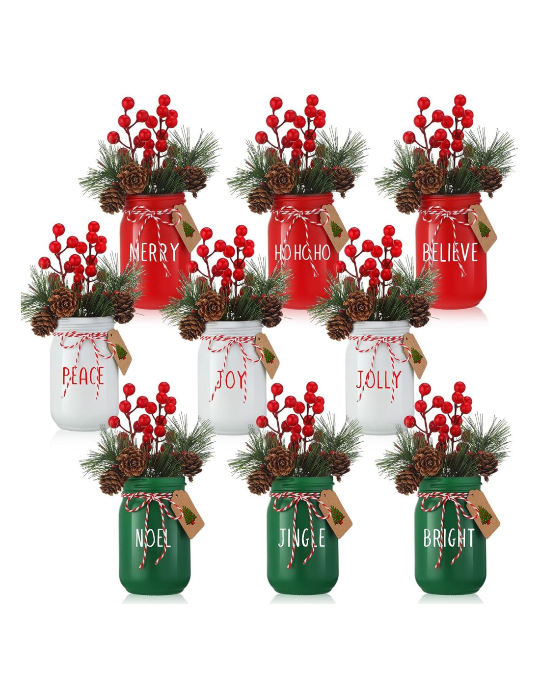 - Centros de mesa navideños festivos y coloridos: ofrecemos decoraciones de tarro de cristal con temática navideña en variedad de rojo, verde y blanco para integrarse perfectamente en tus decoraciones navideñas; nuestro paquete incluye 9 tarros de cristal, 9 ramas de bayas, 9 ramas de agujas de pino, 9 ramas de piña, 1 rollo de cuerda de algodón roja y blanca, 9 tarjetas de papel kraft, 1 hoja de etiquetas, trayendo alegría festiva a tu espacio