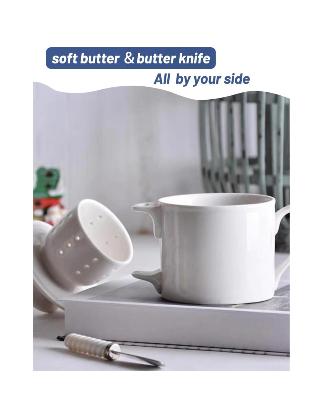 - Diseño Todo en Uno Disfruta de mañanas sin complicaciones con nuestro tazón de mantequilla que mantiene tu mantequilla y cuchillo juntos, perfecto para untar en tostadas sin buscar.