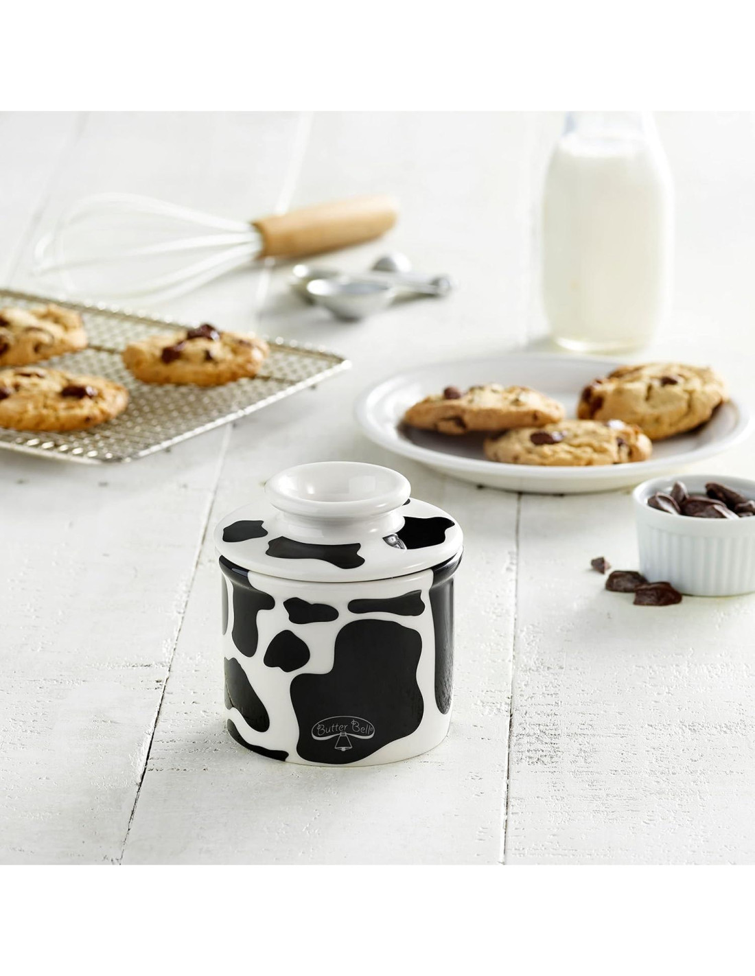 - ESTILO RURAL DE GRANJA CHIC - Para honrar la fuente natural de la mantequilla y aportar un toque de fantasía a la mesa, el crock de mantequilla Cow Butter Bell presenta un patrón de impresión de vaca negra que envuelve completamente la base y la tapa del crock, por lo que el patrón es visible al servir la mantequilla. Un imprescindible para los coleccionistas de productos con patrón de vaca. ¡Es MOO-tástico! Convenientemente dimensionado para una frescura óptima de la mantequilla, el crock es fácil de manejar y se adapta perfectamente a tu mostrador.