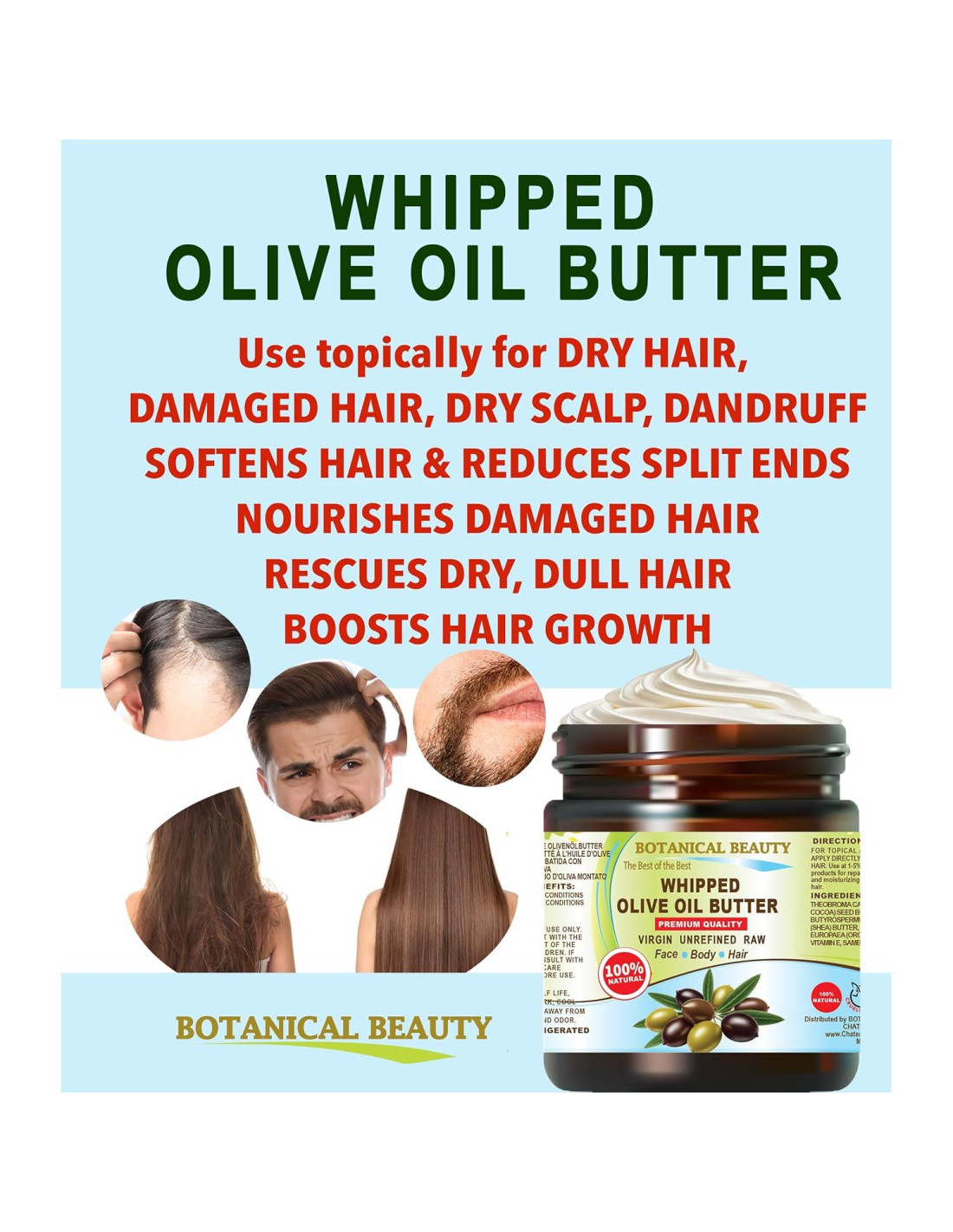La Mantequilla de Aceite de Oliva Batida Botánica es una infusión de Aceite de Oliva Orgánico en Mantequilla de Nuez de Karité (Butyrospermum Parkii) y Mantequilla de Cacao Orgánica. La Mantequilla de Aceite de Oliva Batida Botánica es no comedogénica, ligera y no obstruirá tus poros. Un poco rinde mucho, se absorbe rápidamente, no es grasosa, no se ha probado en animales, SIN CONSERVANTES, Colores o Fragancias Artificiales. MANTENER REFRIGERADO. La Mantequilla de Cacao Orgánica de Crecimiento Silvestre se obtiene de la primera prensada pura de granos de cacao sin cáscara, cosechados de plantaciones de crecimiento silvestre en Brasil con el mayor contenido de ácido láurico, palmítico, esteárico y otros ácidos, y vitamina A, vitamina E. La MANTEQUILLA DE KARITÉ es un superalimento natural para la piel y el cabello de la nuez de Karité africana. Es la fuente natural más rica de vitamina A, vitamina E, vitamina F y ácidos grasos. El Aceite de Oliva Orgánico Extra Virgen Prensado en Frío es el más rico en vitaminas y minerales. Úsalo tópicamente para piel dañada como QUEMADURAS, HERIDAS, CORTES, CICATRICES, PICAZÓN, ESCAMOSO, CICATRICES DE ACNÉ, PIEL SECA, PIEL AGRETADA, Manos Agrietadas, LABIOS RESECOS, CELULITIS, CONDICIONES DE PIEL IRRITADA COMO ECZEMA y PSORIASIS, es ideal para calmar la piel seca y escamosa. Antienvejecimiento, Antarrugas, Iluminador, Hidratante, Humectante, Nutritivo, Rejuvenecedor, Suavizante, Acondicionador. Es un poderoso aceite hidratante, perfecto Aceite Hidratante Natural para la Piel, Aceite Facial para la Piel, Suero Hidratante para la Piel, Hidratante para el Rostro, Aceite para el Rostro, Aceite para el Cabello. Es tan rico en vitaminas y minerales que es el mejor aceite para productos de cuidado de la piel natural y antienvejecimiento con propiedades restauradoras para todo tipo de piel, especialmente para tipos de piel SECAS y MADURAS. Úsalo tópicamente para CABELLO SECO, CABELLO DAÑADO y CUERO CABELLUDO SECO, CASPA. Sus propiedades hidratantes pueden ayudar a calmar condiciones irritadas o con picazón del cuero cabelludo. Repara las puntas abiertas y los cabellos quebrados, doma el cabello encrespado, suaviza la superficie y fortalece y suaviza el cabello. Al fortalecer e hidratar tu cabello, ayudas a que retenga ondas y rizos.