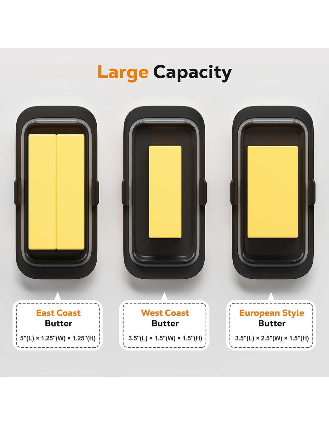 - Gran Capacidad: Compatible con mantequilla de hasta un tamaño máximo de 5.88" (14.88cm) * 2.68" (6.88cm) * 1.68" (4.28cm). Adecuado para mantequilla francesa, mantequilla irlandesa, mantequilla americana, mantequilla de la Costa Este y Costa Oeste, así como mantequilla europea.