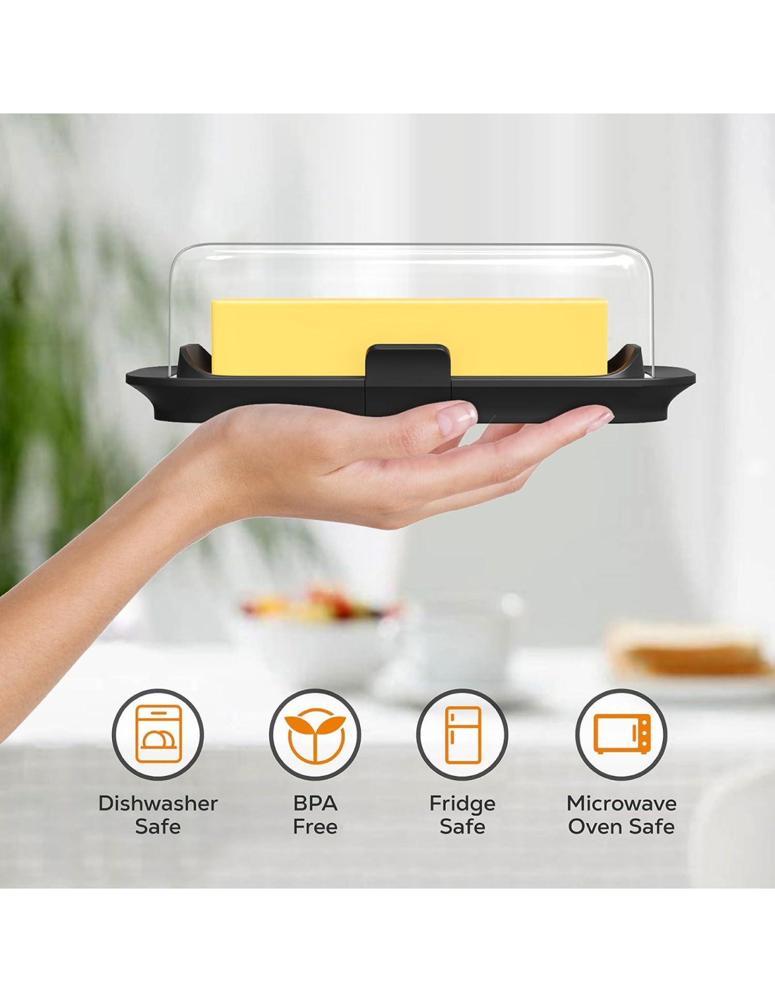 - Marcas de Medición TBSP: Las líneas de escala en el soporte de mantequilla te ayudan a controlar tu ingesta de calorías y medir la cantidad deseada de mantequilla.