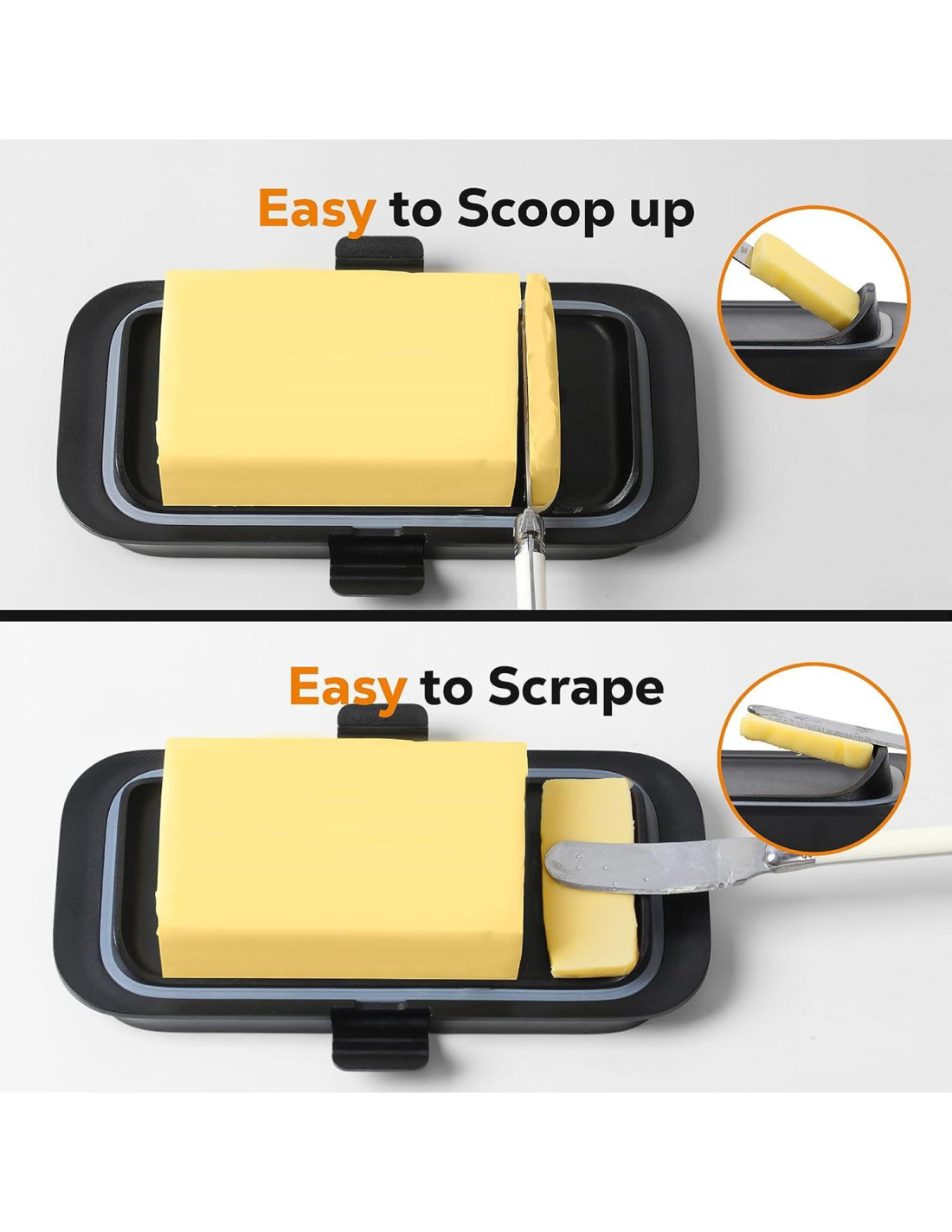 - Cierres de Seguridad: El diseño de cierres de seguridad únicos proporciona un mejor ambiente sellado para la mantequilla, es a prueba de gatos y perros, evitando que se deslice fácilmente fuera de la caja o sea robada por tu querido gato o perro.