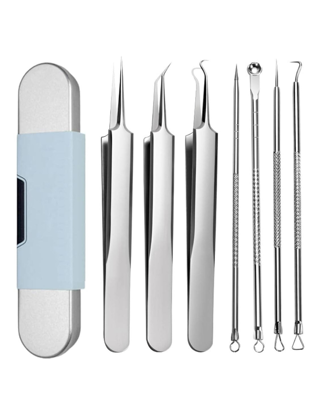 - KIT DE HERRAMIENTAS PARA EXPRIMIR GRANOS: incluye 4 agujas para granos - aguja gruesa, aguja curva, cuchara pequeña, aguja fina para satisfacer diferentes necesidades. La aguja gruesa puede remover granos grandes, la aguja curva puede perforar granos rebeldes, la cuchara pequeña puede remover acné y pápulas, y la aguja fina puede remover pequeños puntos negros. Puede ayudar a remover fácilmente puntos negros, puntos blancos, granos, acné y dar forma a las cejas.