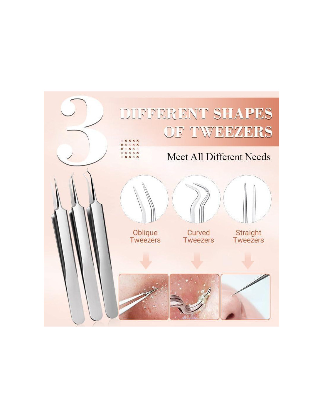 - SET DE PINZAS PARA REMOCIÓN DE PUNTOS NEGROS: incluye 3 formas diferentes de herramientas para remover puntos negros - pinzas rectas, pinzas oblicuas, pinzas curvas para satisfacer diferentes necesidades. Exprimidor de granos con pinzas rectas, adecuado para granos, acné y puntos negros en la superficie. Extractor de puntos negros con pinzas curvas, adecuado para granos, acné y puntos negros persistentes en ambos lados de la nariz. Pinzas oblicuas para la remoción de puntos negros: adecuado para áreas planas de la barbilla y la frente.