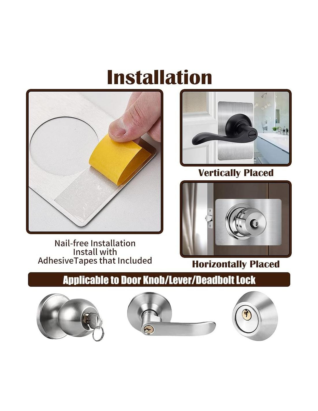 - Aplicable a la mayoría de los pomos de puerta/cerraduras de palanca estándar y cerraduras de pestillo. Se puede usar en puertas de madera o metal.