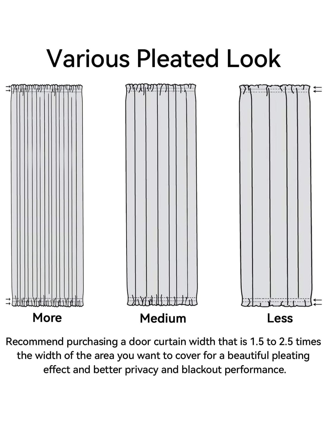 - Fácil Instalación: Esta cortina funcional ofrece 2 métodos de colgado. Método 1: No se necesitan herramientas ni varillas de cortina, simplemente pega las tiras adhesivas (adecuadas para puertas de vidrio/esmaltadas/de madera/de metal) en el marco de la puerta, luego asegura el panel de cortina usando la cinta mágica proporcionada. Método 2: Conceal la varilla de cortina dentro de los bolsillos para varilla.