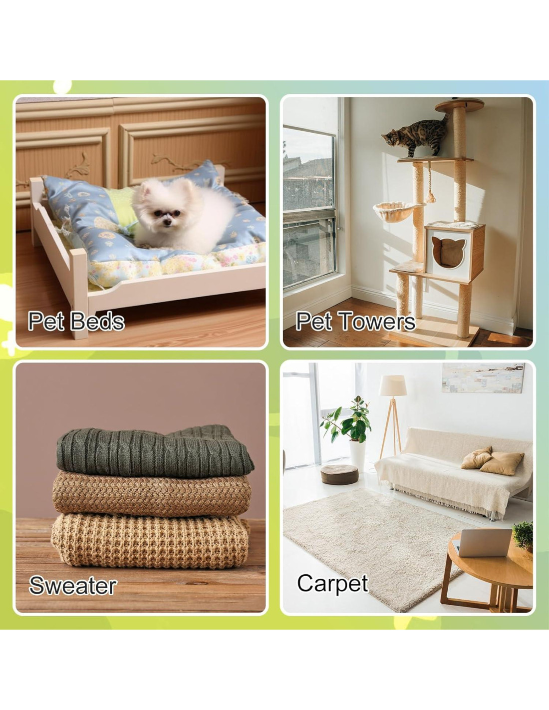 - Ampliamente Aplicado: dos estilos diferentes de herramientas reutilizables para quitar pelo de mascotas pueden ser adecuados para una amplia gama de propósitos, no solo alfombras, alfombras, sofás, muebles, mantas, árboles para gatos, tapicería de coches, ropa de invierno y otros artículos pesados; También se puede aplicar para telas suaves y delgadas, como tapicería, alfombrillas, sábanas, sudaderas, etc.