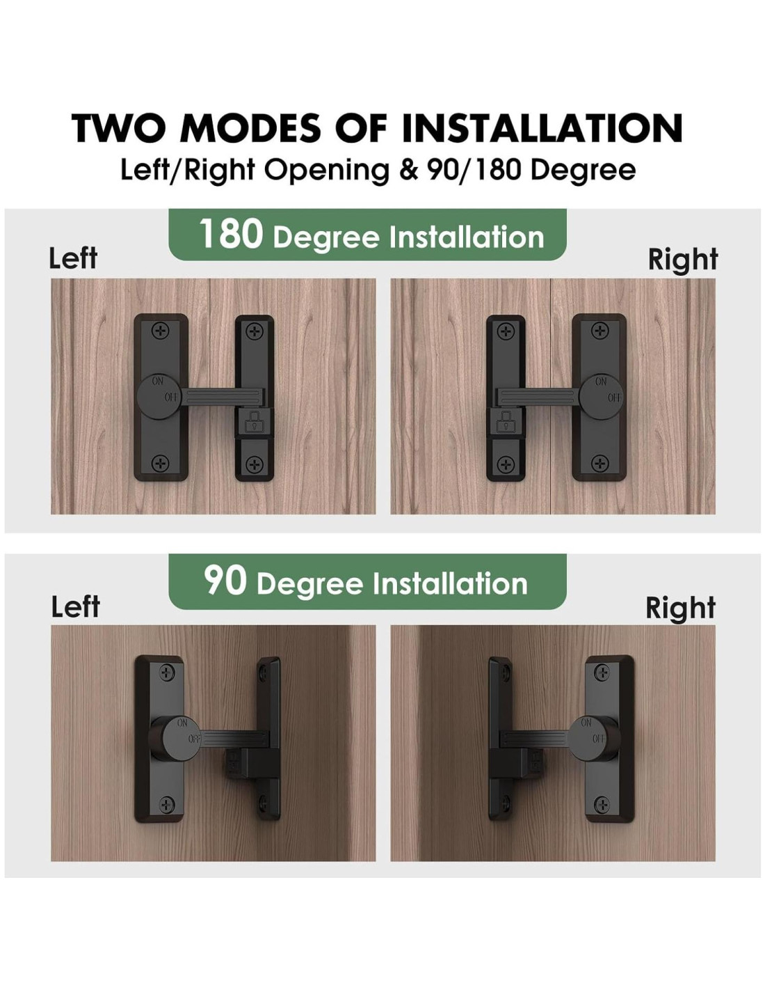 - Múltiples Modos de Instalación: Las cerraduras de la puerta se pueden instalar a 90 o 180 grados. El hardware de la cerradura de la puerta es adecuado para puertas oscilantes o deslizantes. Conveniente y flexible, puedes elegir el modo de instalación según la situación de la puerta o tu preferencia.