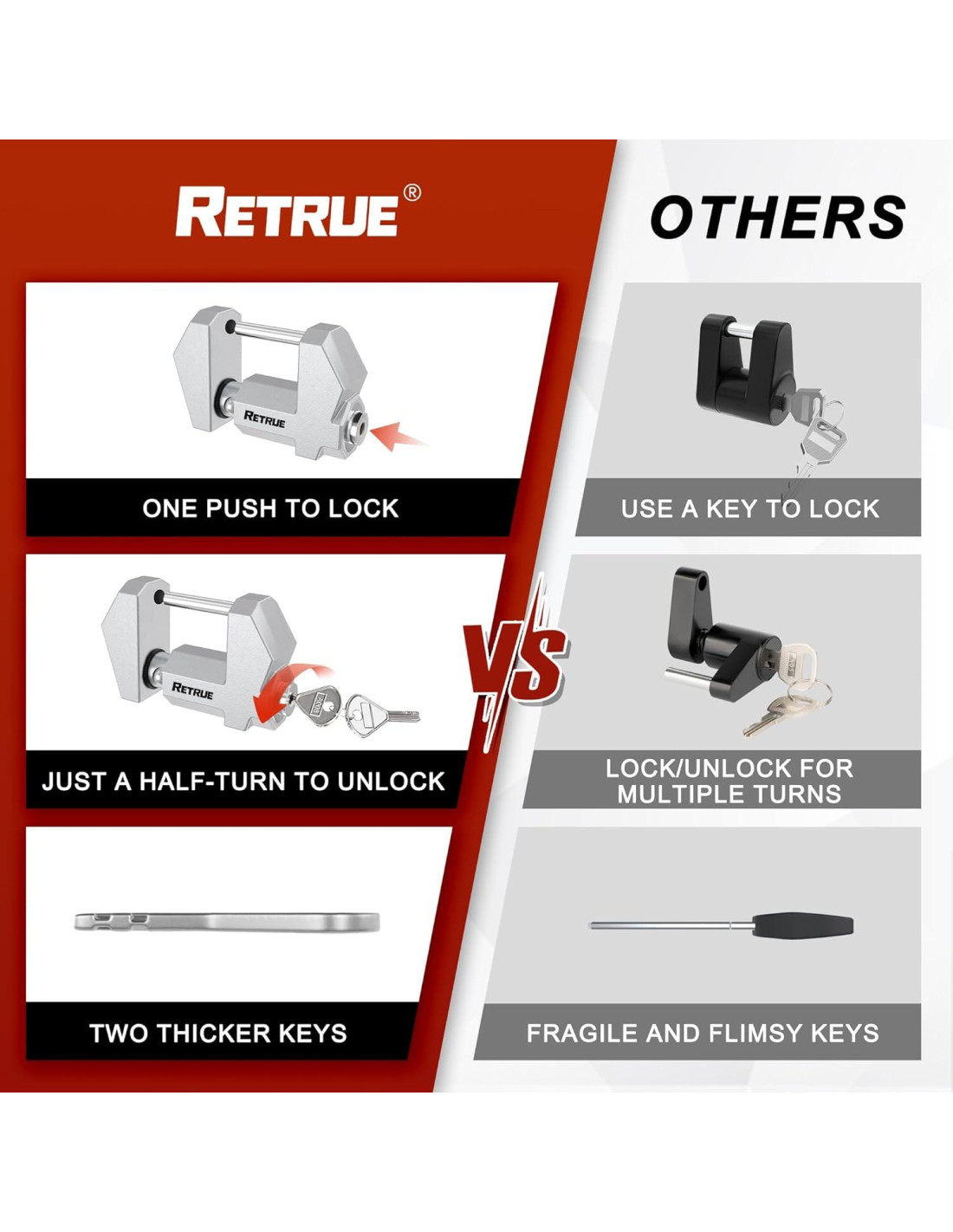 - DISEÑO FÁCIL DE USAR: La cerradura cibernética RETRUE presenta un diseño intuitivo que simplifica el proceso de bloqueo y desbloqueo. Con 'Una Presión para Bloquear', ofrece una alternativa más simple a las cerraduras de remolque tradicionales, eliminando la necesidad de múltiples giros, solo un medio giro para desbloquear.