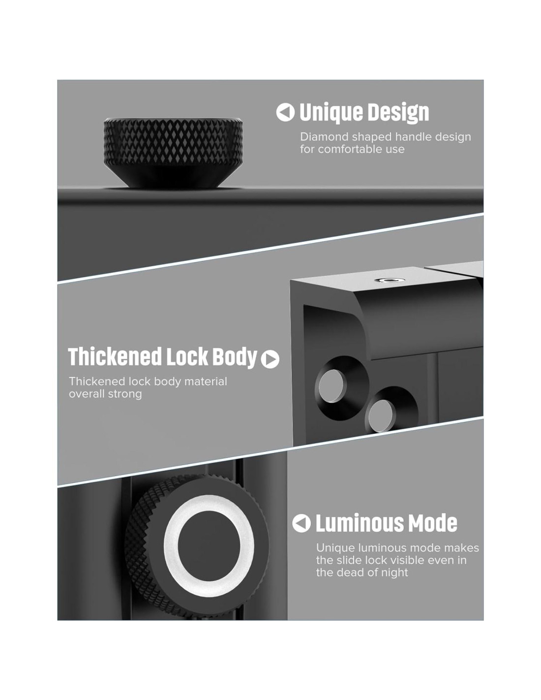 - Efecto luminoso: Los pestillos para puertas tienen un modo luminoso nocturno, por lo que puedes ver claramente la posición de la cerradura de la puerta por la noche o en una habitación con poca luz. (Nota: la cerradura de la puerta necesita estar en un lugar brillante para absorber la luz solar durante el día, si se instala en un lugar oscuro, no brillará por la noche.)
